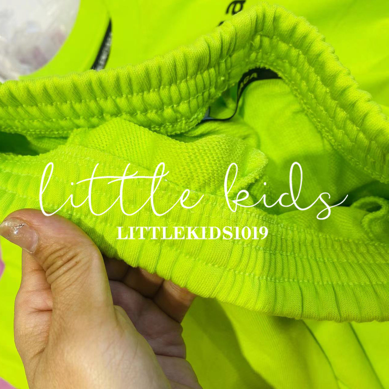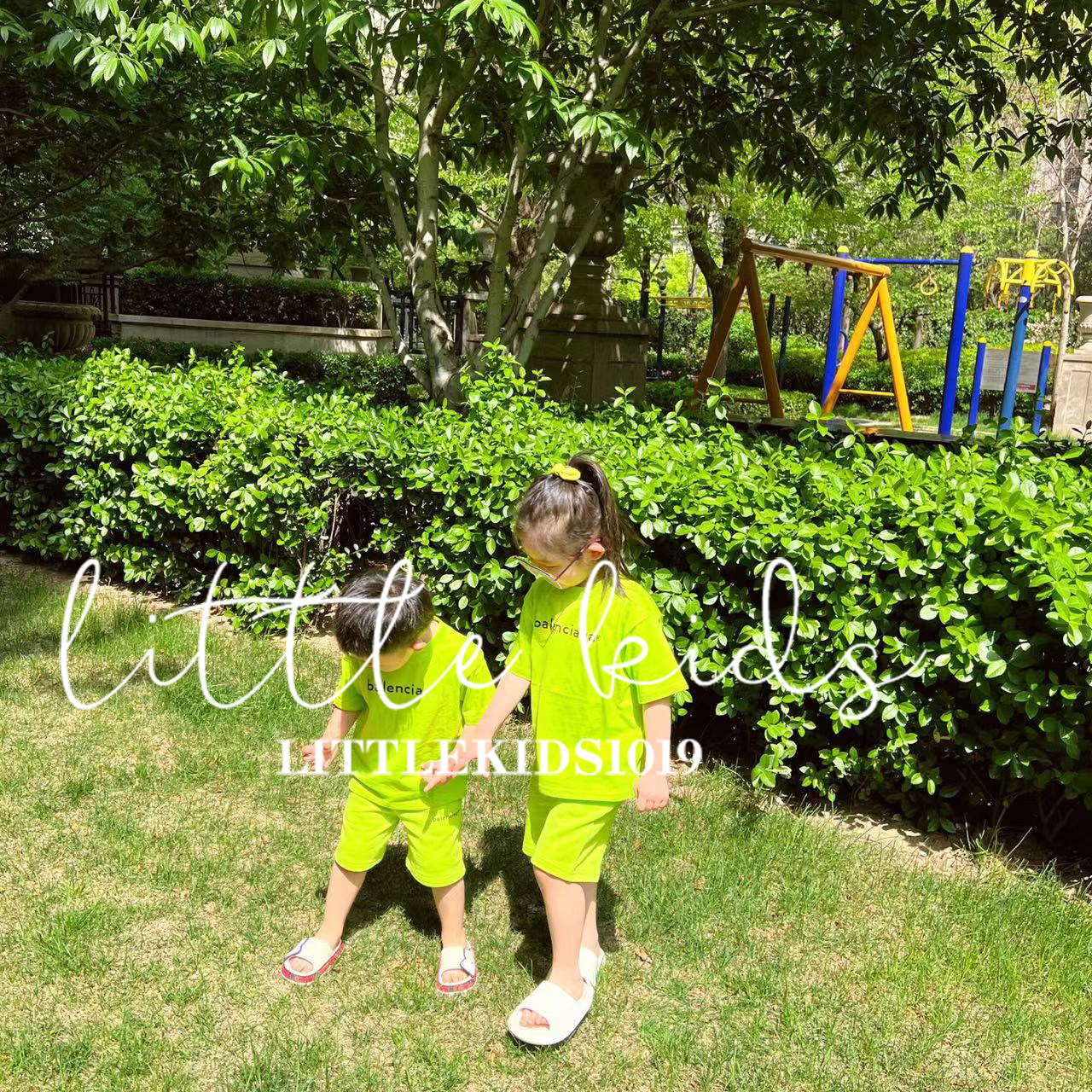 「现货」儿童女童男童宝宝兄妹圆领荧光绿色字母短袖T恤短裤套装