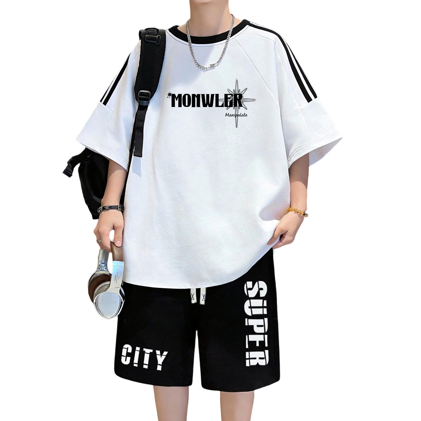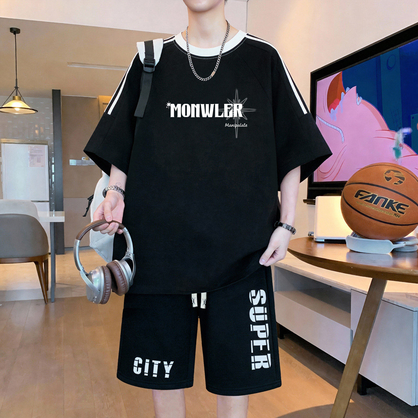 纯棉短袖t恤男孩夏季套装初中高中学生青少年大童帅气运动两件套