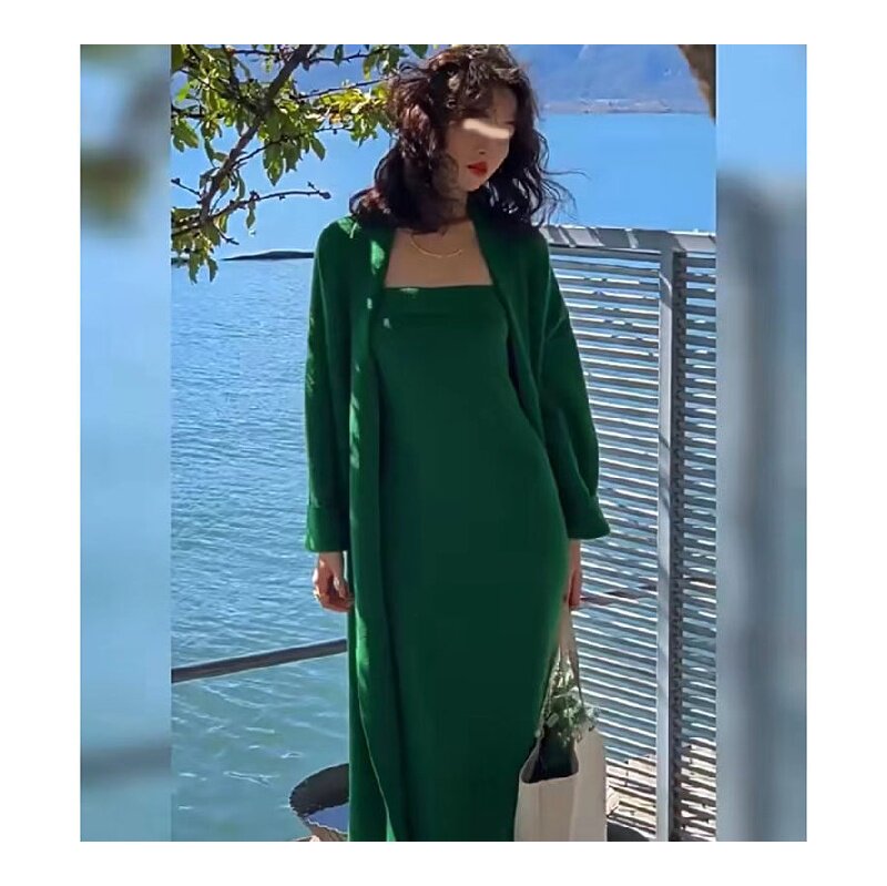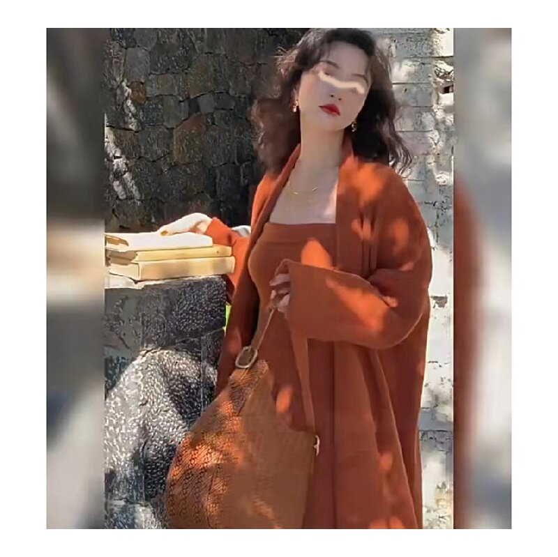 大码胖MM慵懒风休闲百搭长款针织开衫春季新款收腰修身抹胸连衣裙