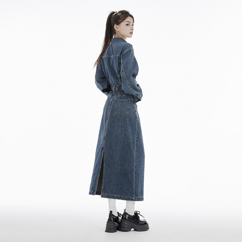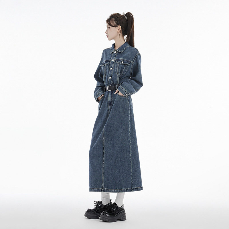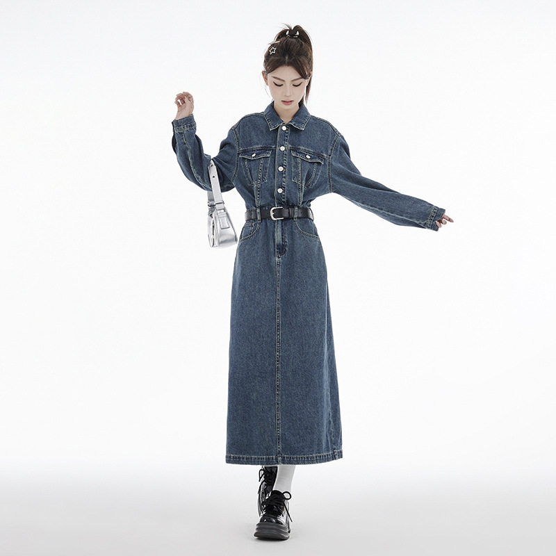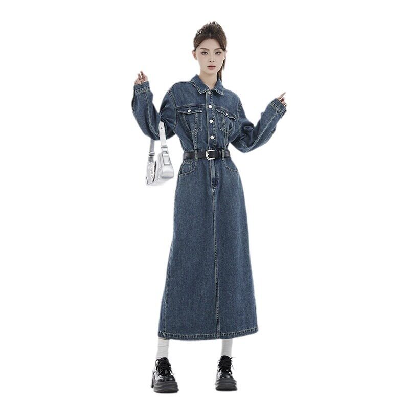 复古牛仔套装连衣裙女春季2026新款连体长袖收腰开叉长裙高腰显瘦