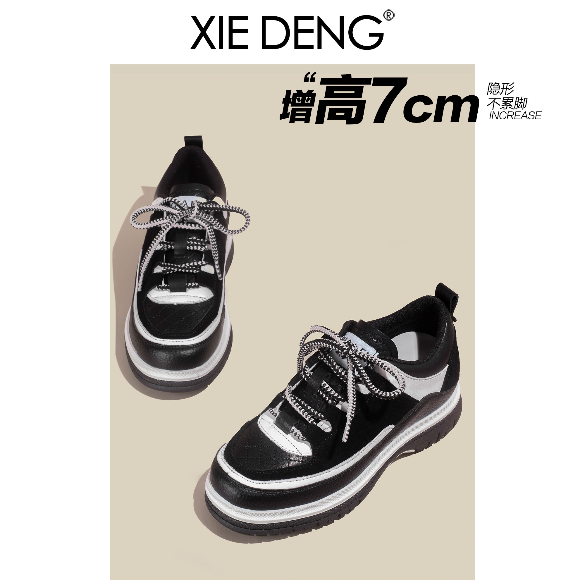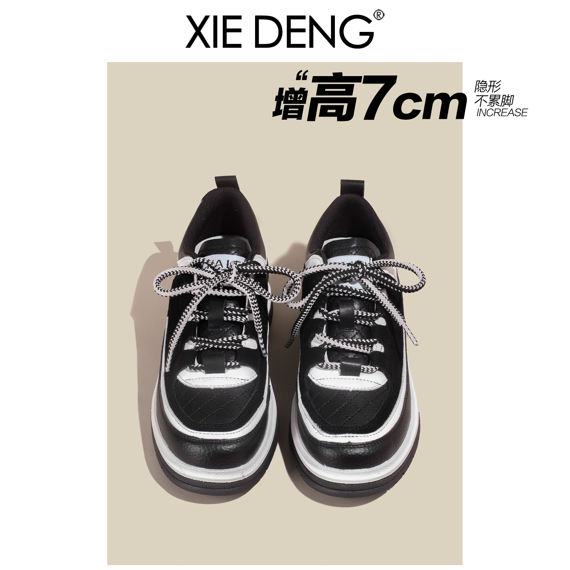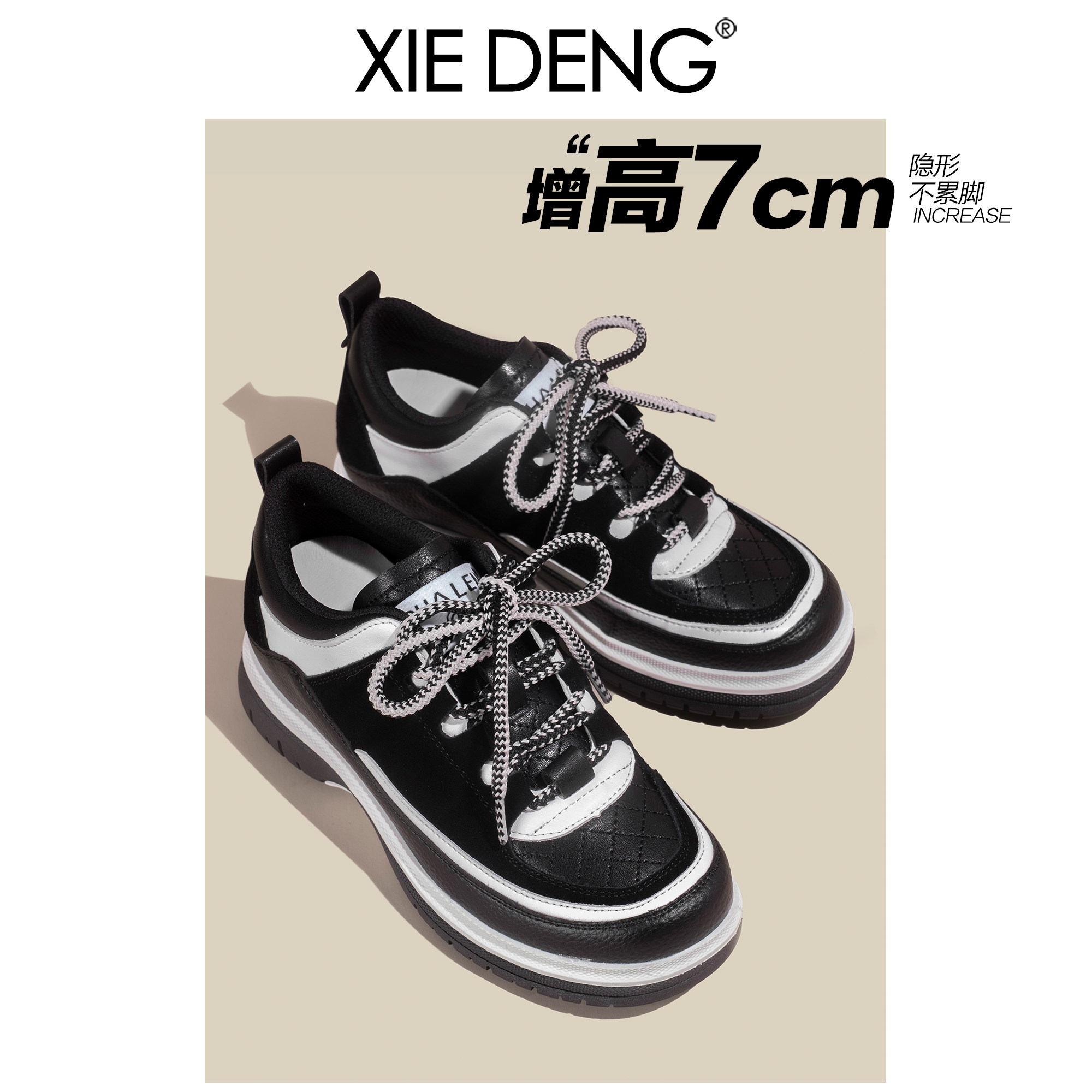 「鞋登」7CM黑白熊猫鞋菱格小香风2026新款厚底增高拼色老爹鞋女