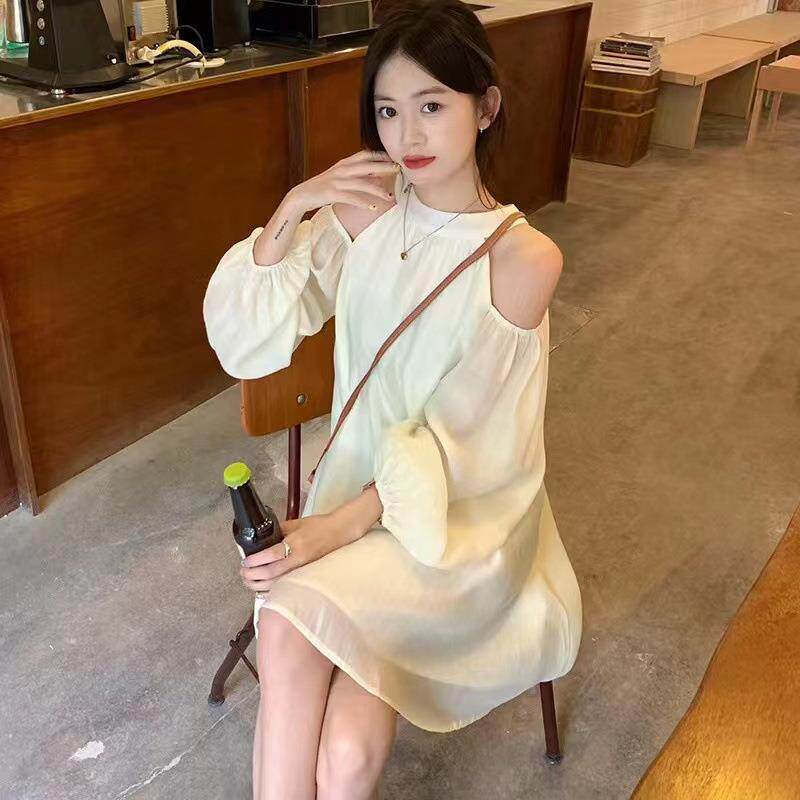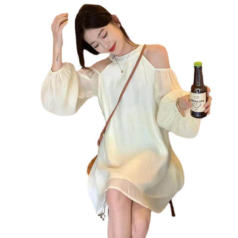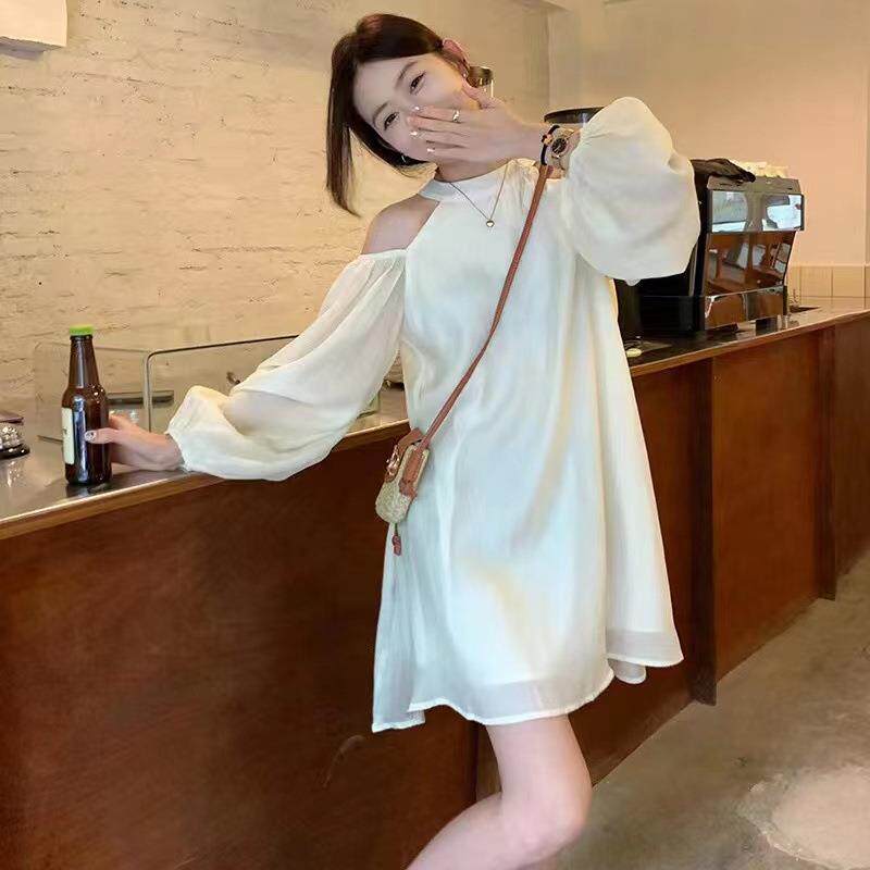 纯色设计感露肩雪纺长袖挂脖连衣裙女夏季小个子初恋仙女裙短裙子