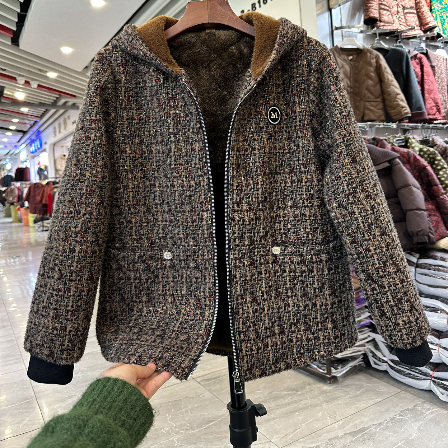 时尚格子连帽拉链外套女宽松加绒加厚保暖洋气棉服冬季格子纹棉衣