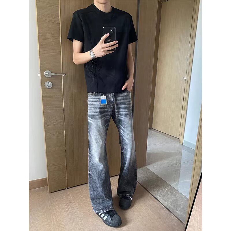 加长浅蓝色微喇牛仔裤男女款春季美式高街显瘦裤子cleanfit直筒裤