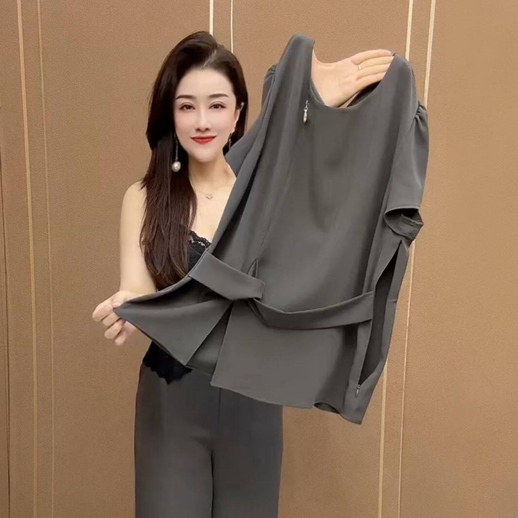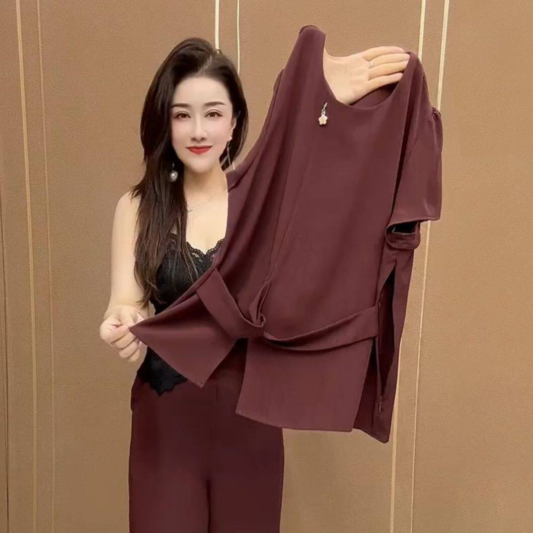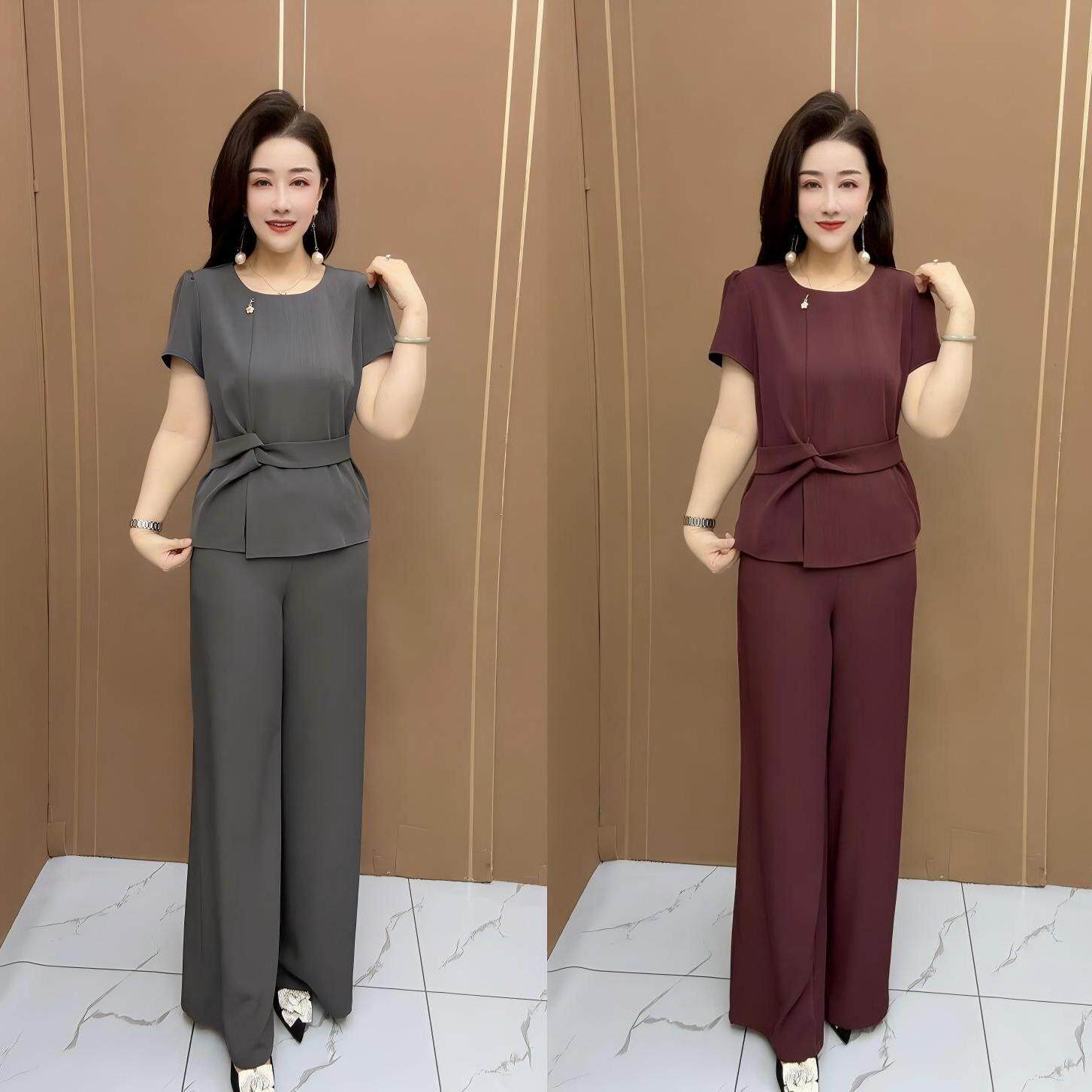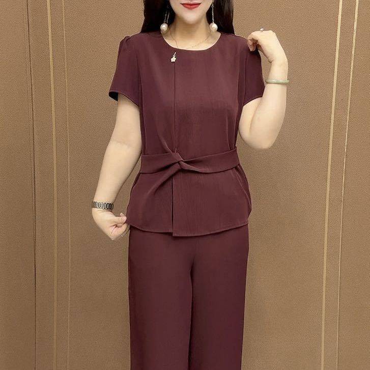 高级感纯色时尚套装2026夏季新款短袖上衣休闲裤子妈妈收腰两件套