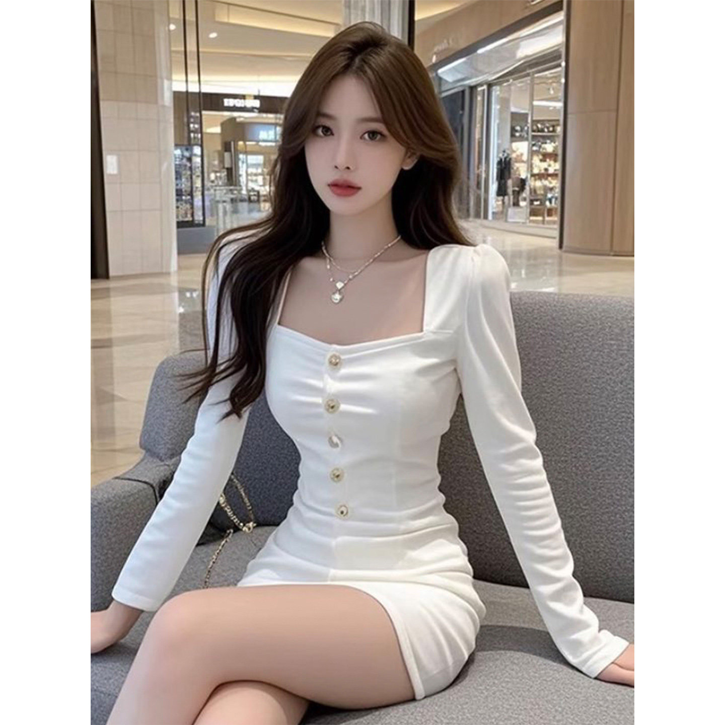 气质纯欲辣妹白色方领长袖连衣裙女2026新款修身显瘦短款包臀裙