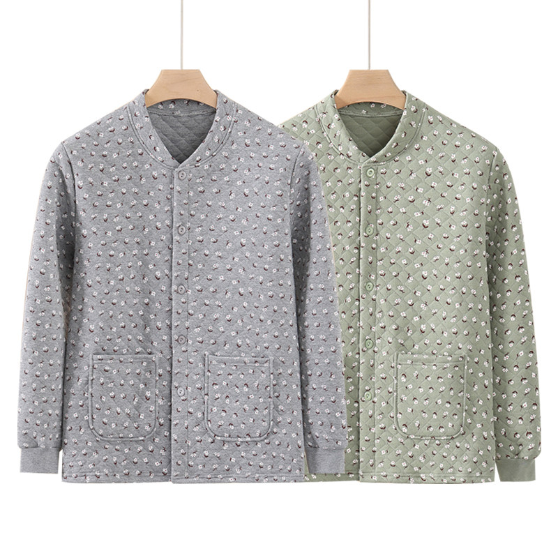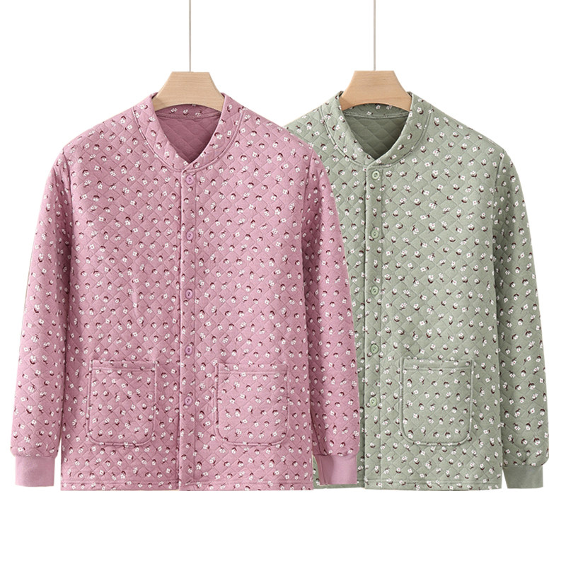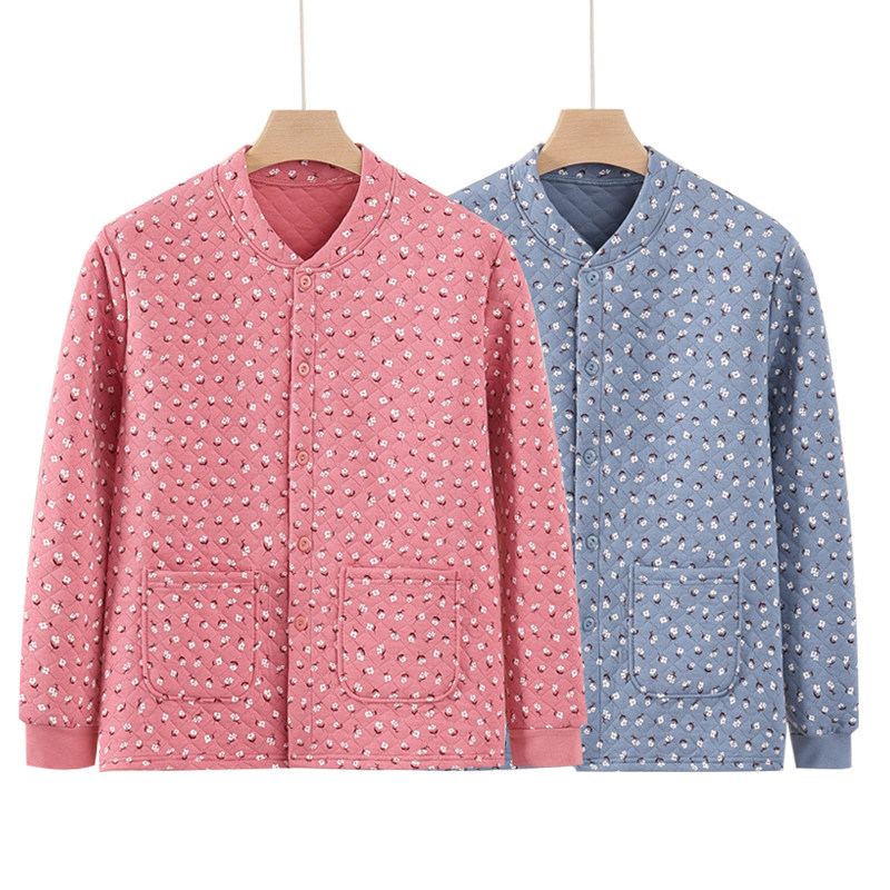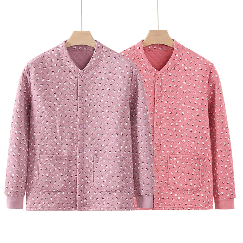 女士三层夹棉保暖上衣中老年前开扣睡衣纯棉加厚开衫长袖内衣大码