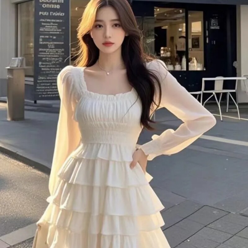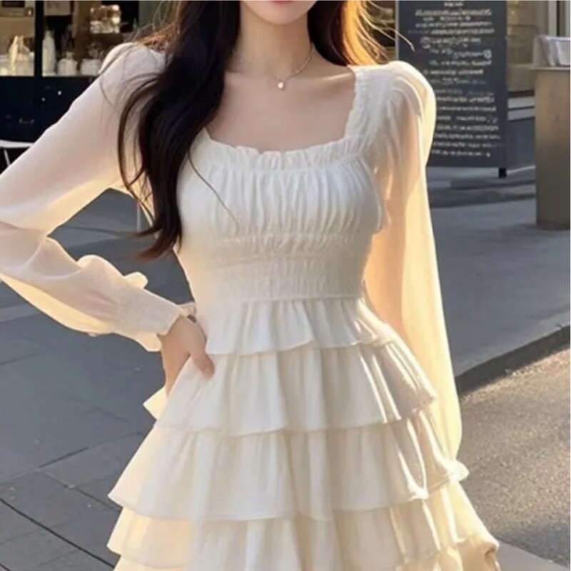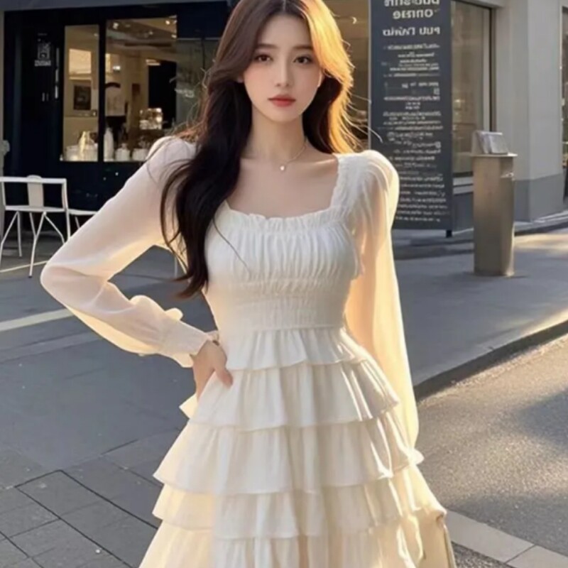 法式名媛甜美温柔风长袖方领连衣裙女2025春季新款收腰显瘦蛋糕裙