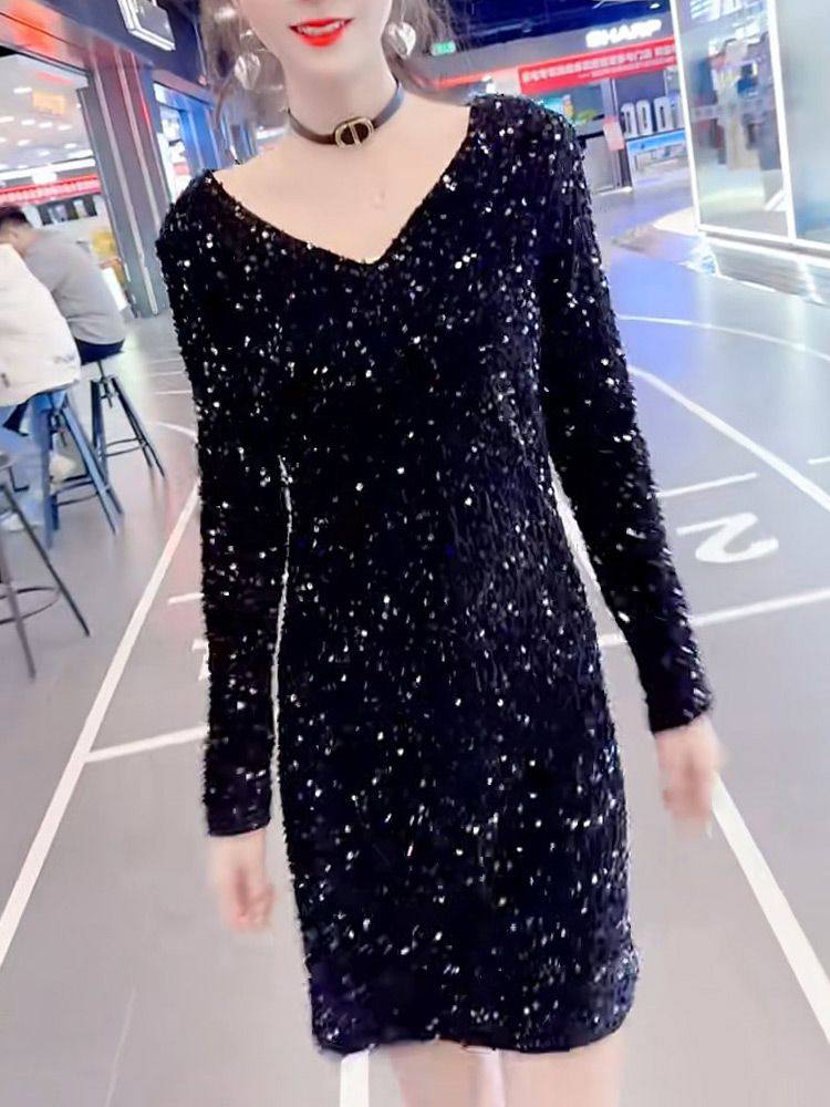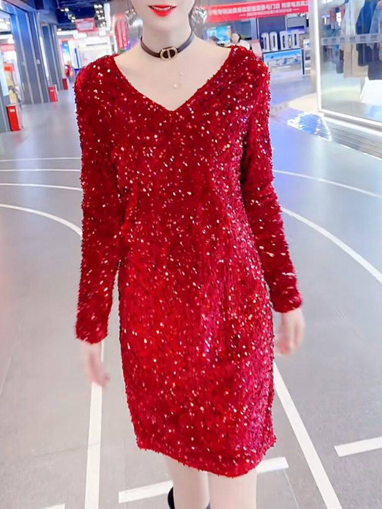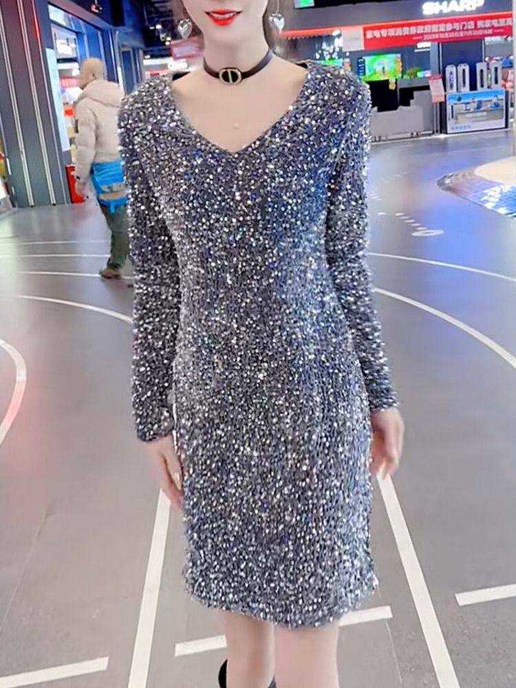 2026春季新款显瘦洋气亮片连衣裙时尚纯色中长款百搭大码气质裙子