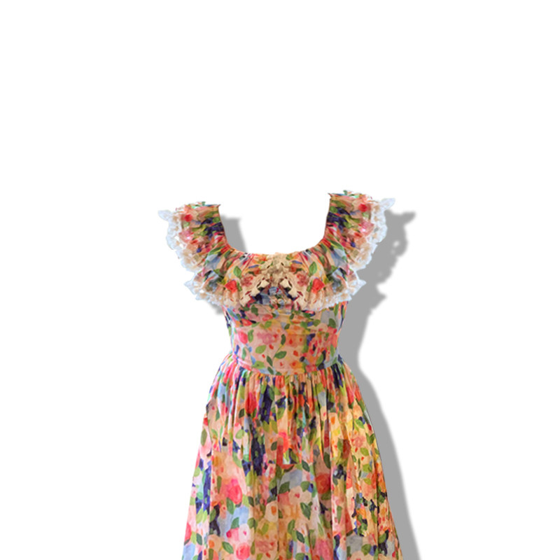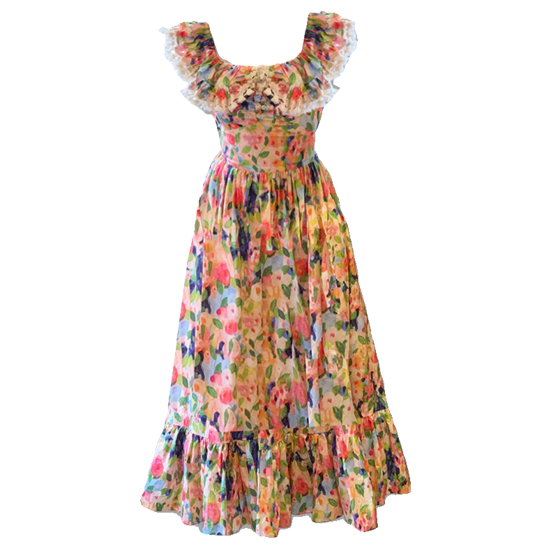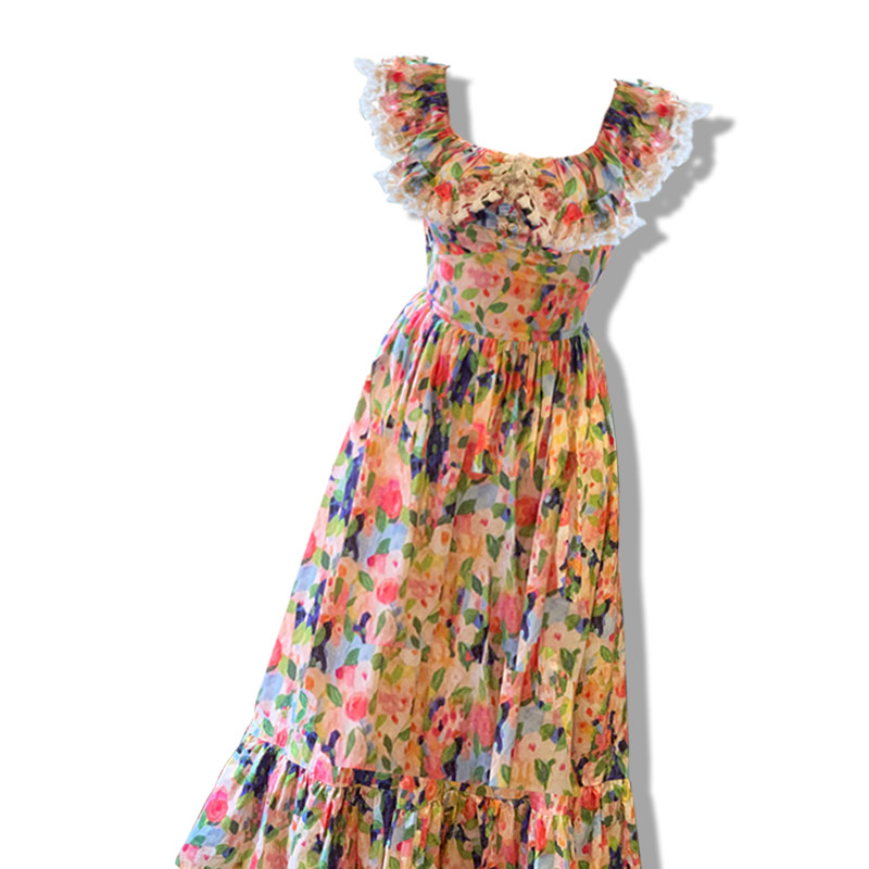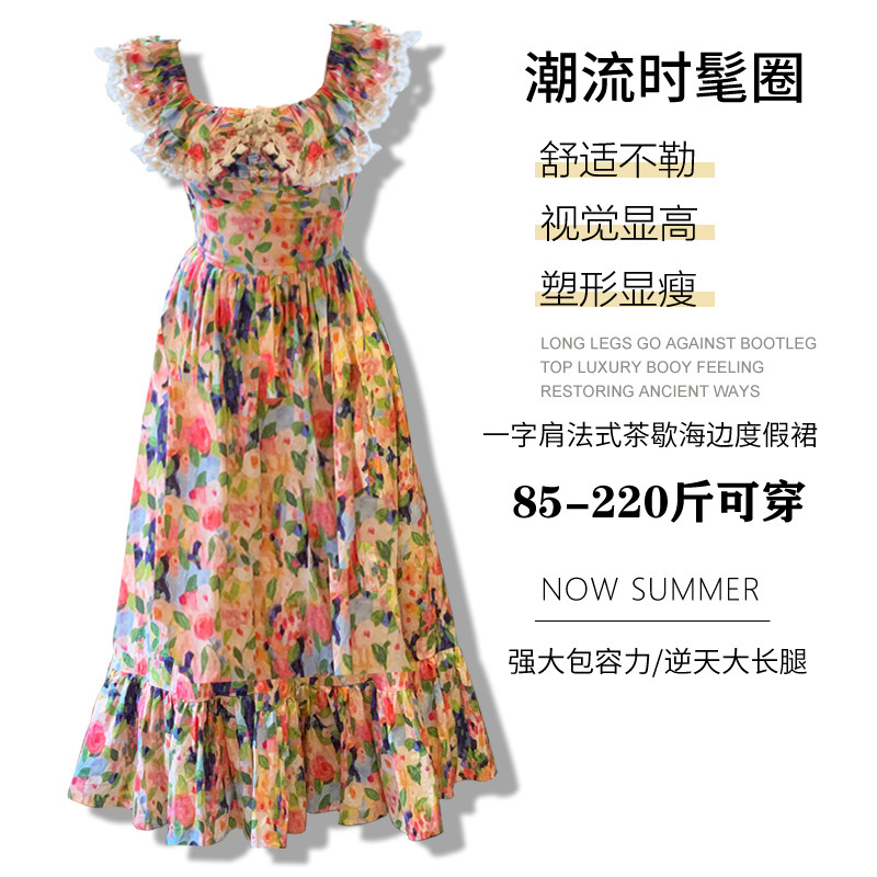 大码女装夏季连衣裙胖mm新款彩色碎花一字肩法式茶歇海边度假长裙