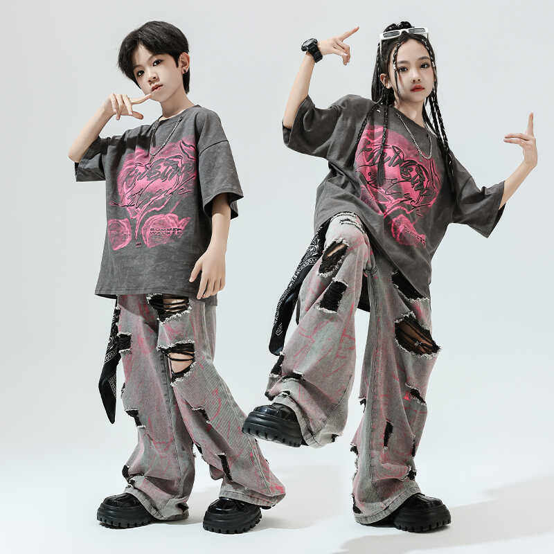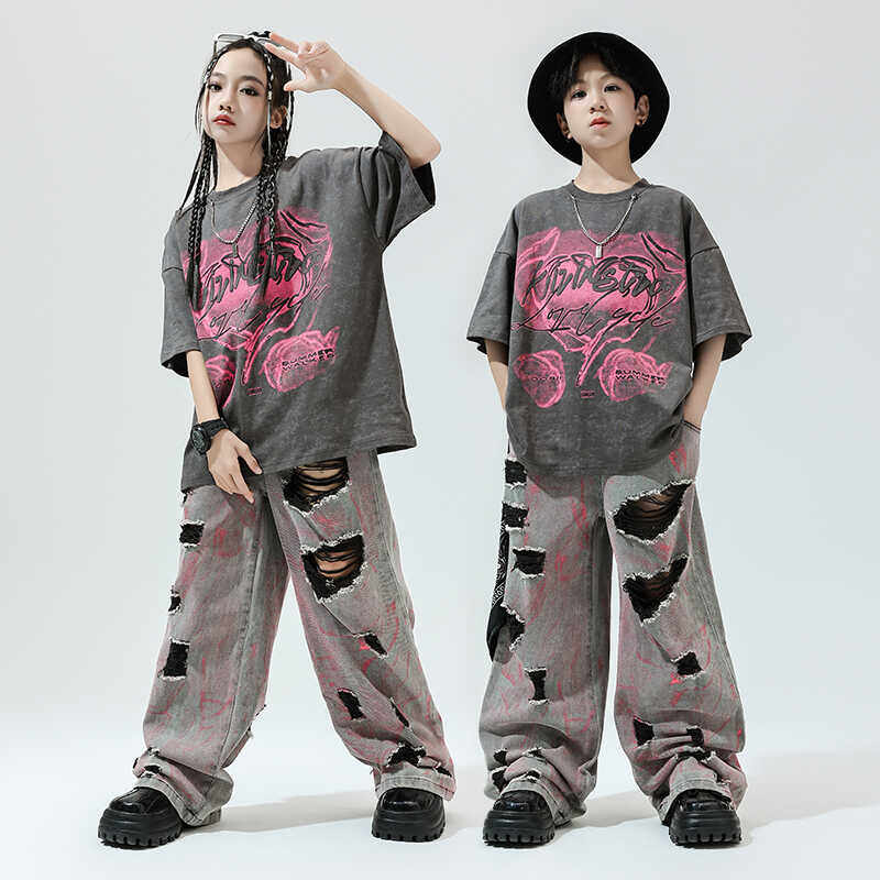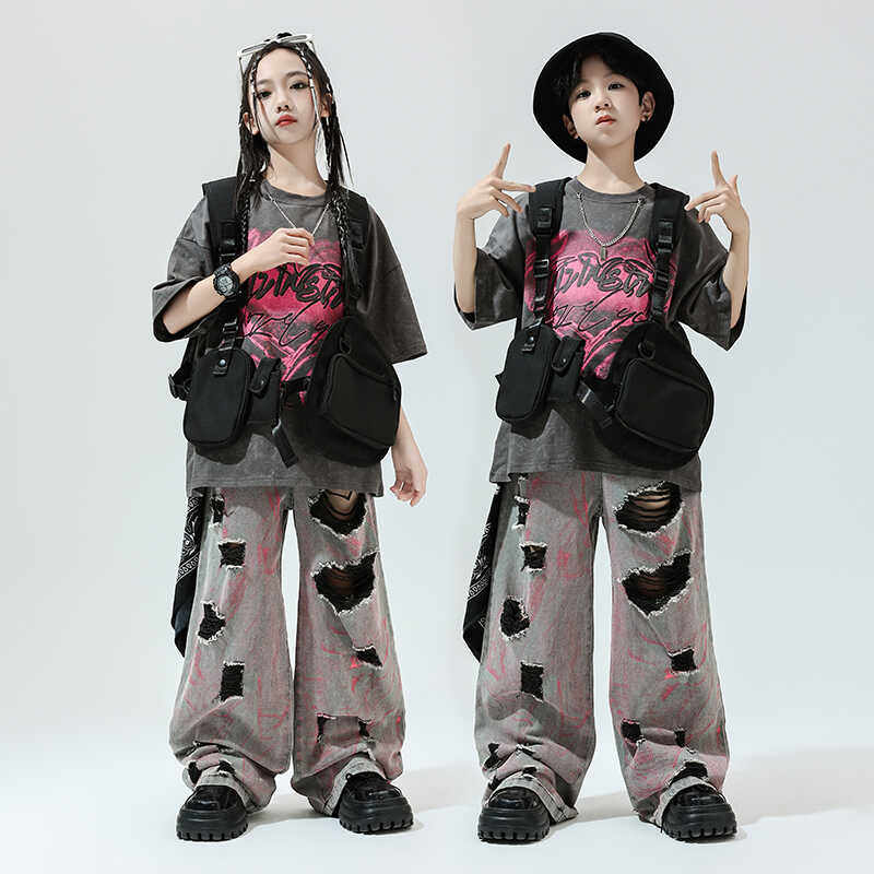儿童街舞潮服套装演出服hiphop嘻哈做旧T恤套装男女童爵士舞服装