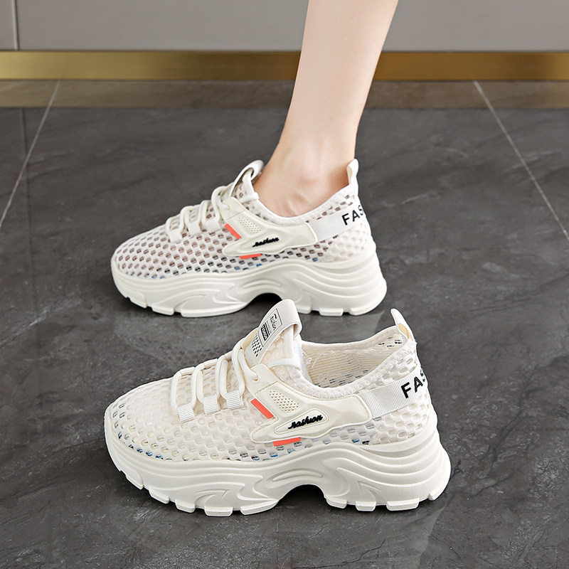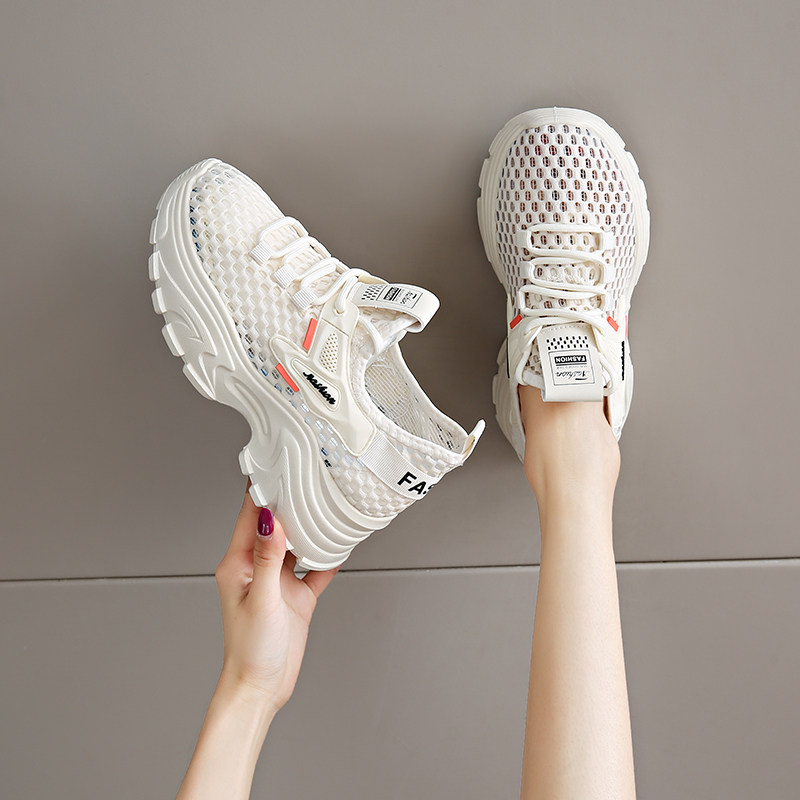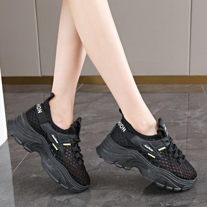 透气黑色运动鞋女夏季镂空薄款厚底老爹鞋34码不累脚防滑工作网鞋