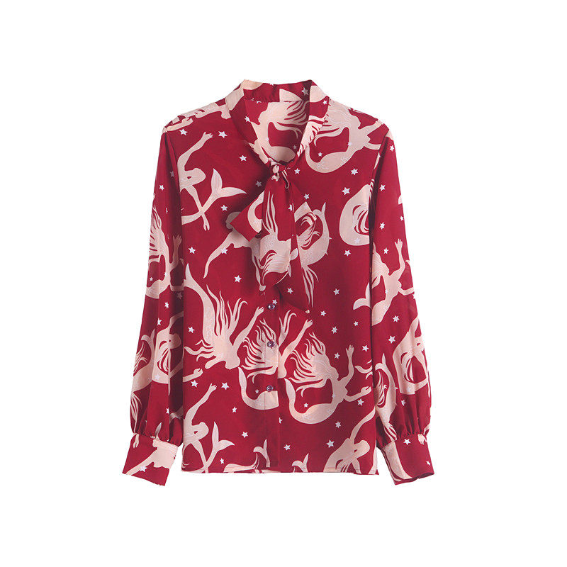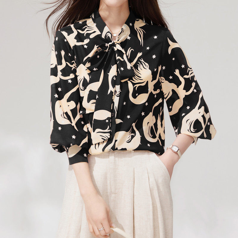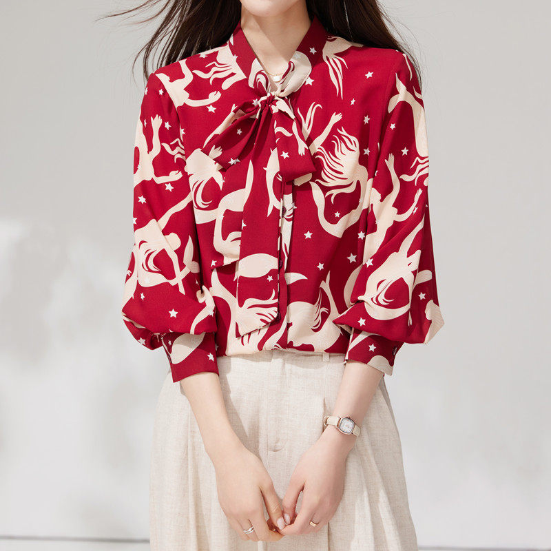 春装衬衫女款2026新款洋气减龄系带蝴蝶结上衣高级感百搭印花衬衣