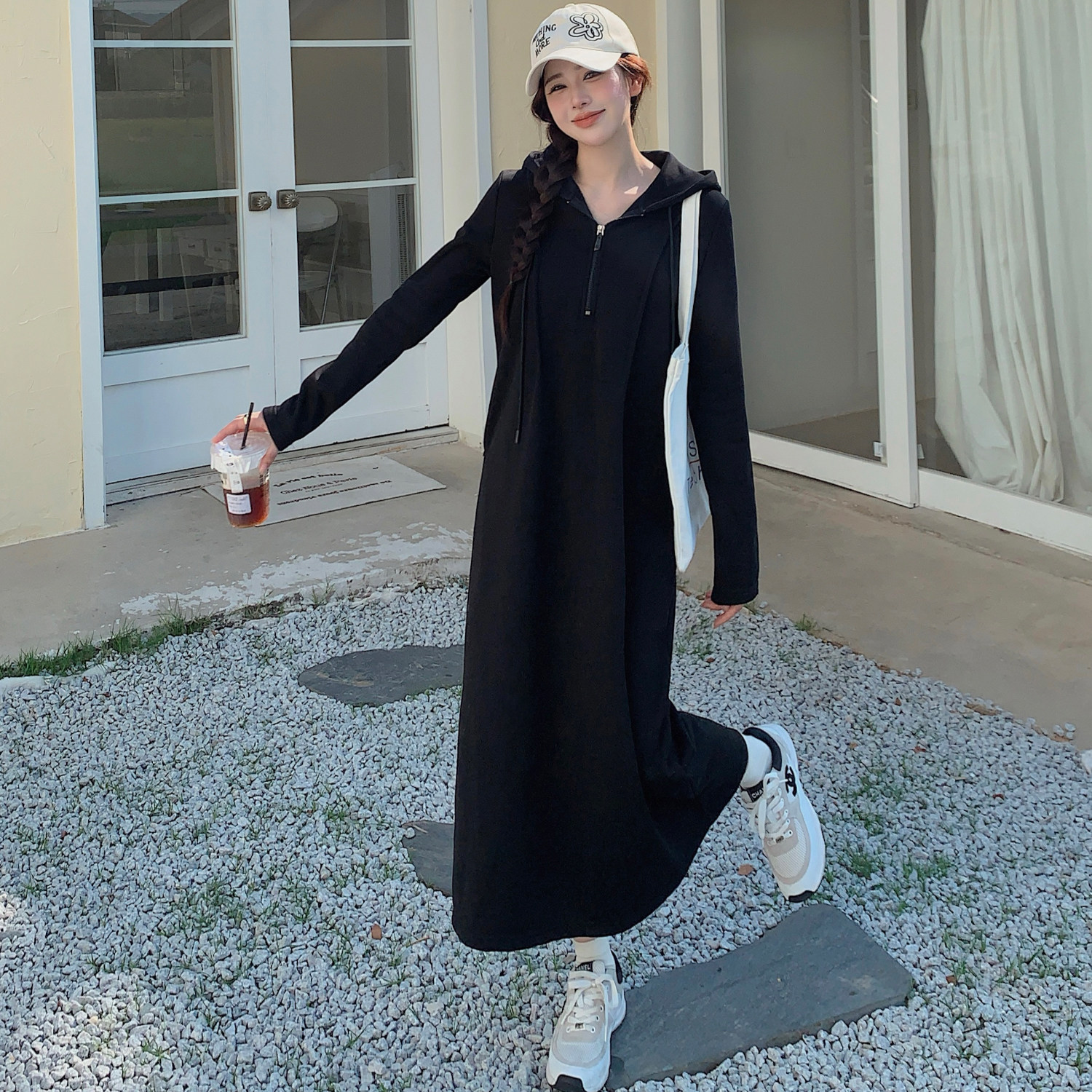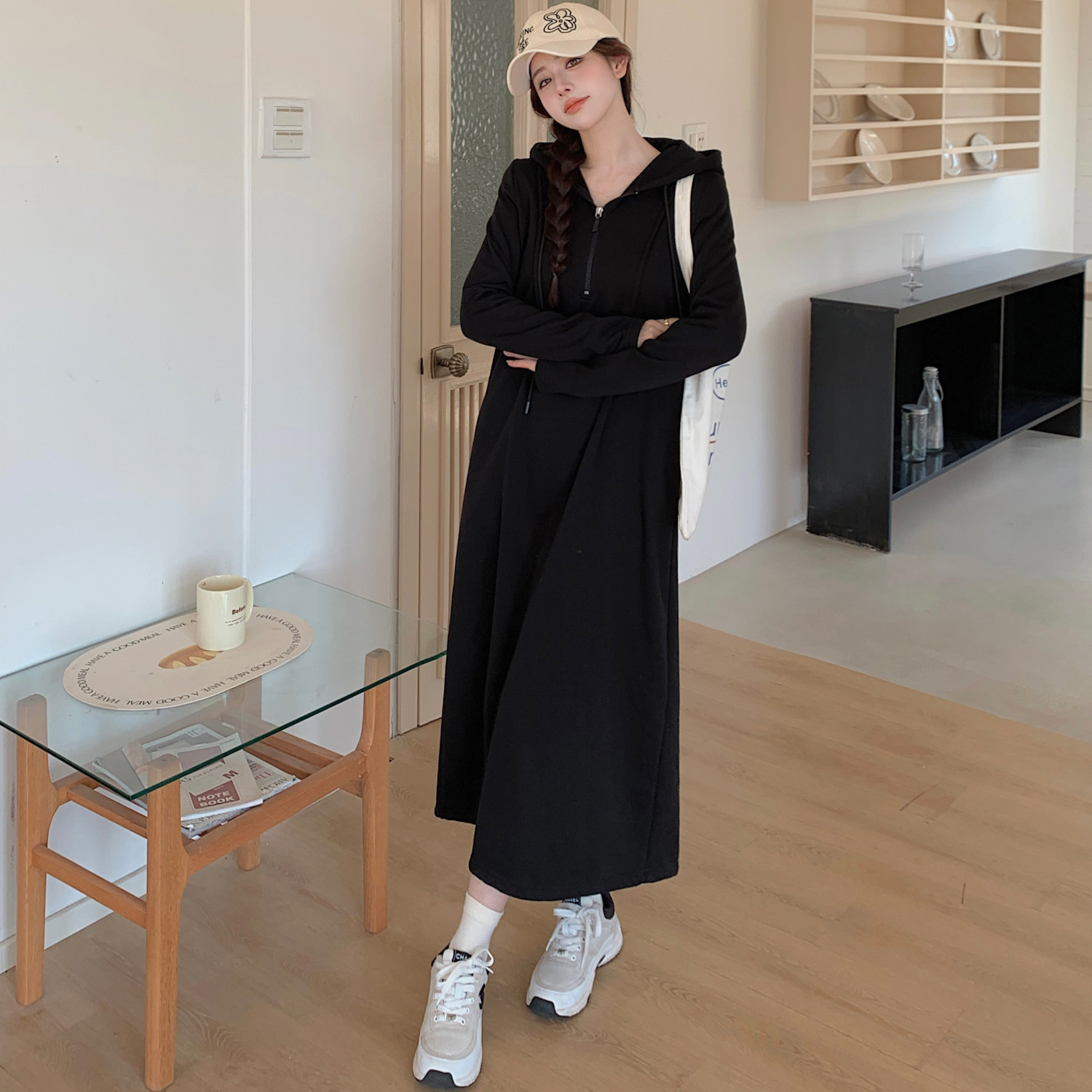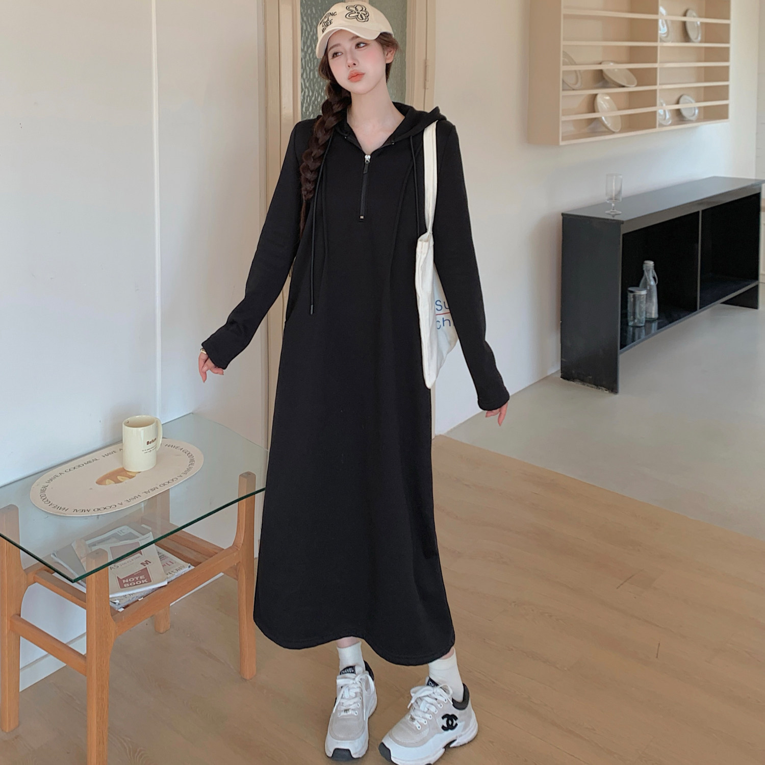 秋冬季新款大码女装胖mm拉尔夫连衣裙显瘦连帽长款卫衣小黑裙女