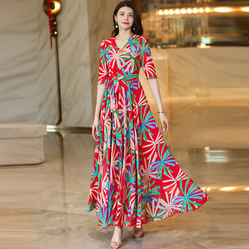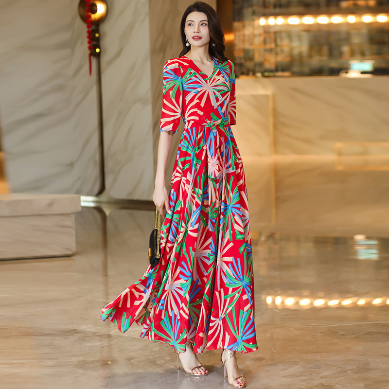 2026春夏新款V领印花连衣裙收腰显瘦短款小个子长裙妈妈款沙滩裙