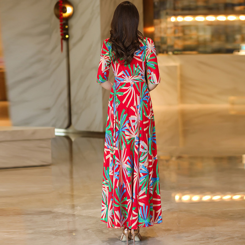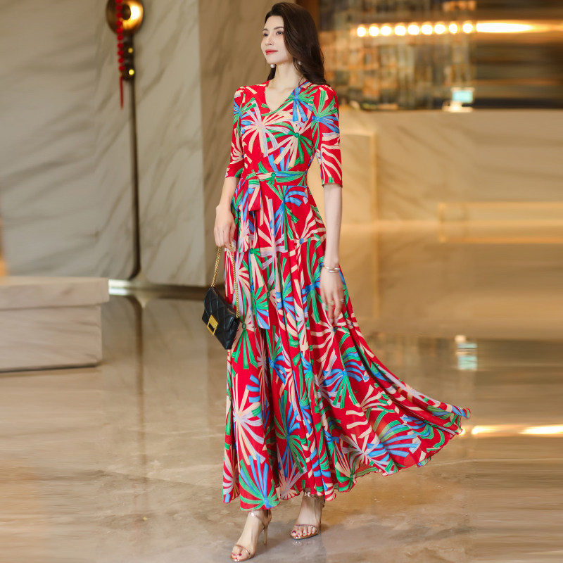 311线报网描述:V领印花连衣裙大摆裙修身显瘦长裙