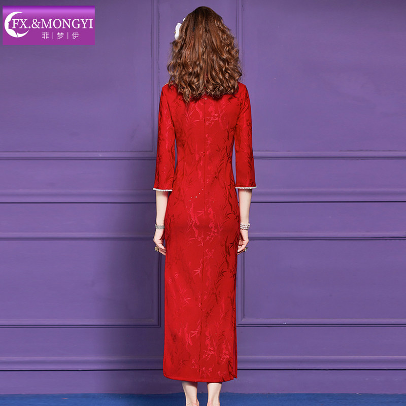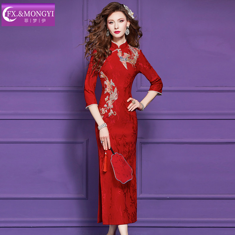 菲梦伊重工刺绣钉珠红色连衣裙女春季国风立领修身开叉改良旗袍裙