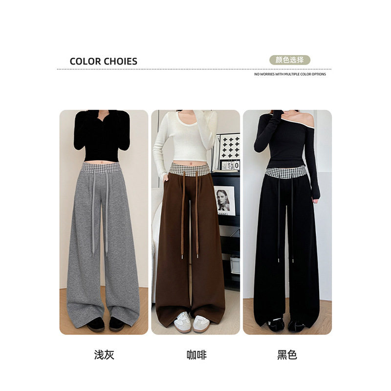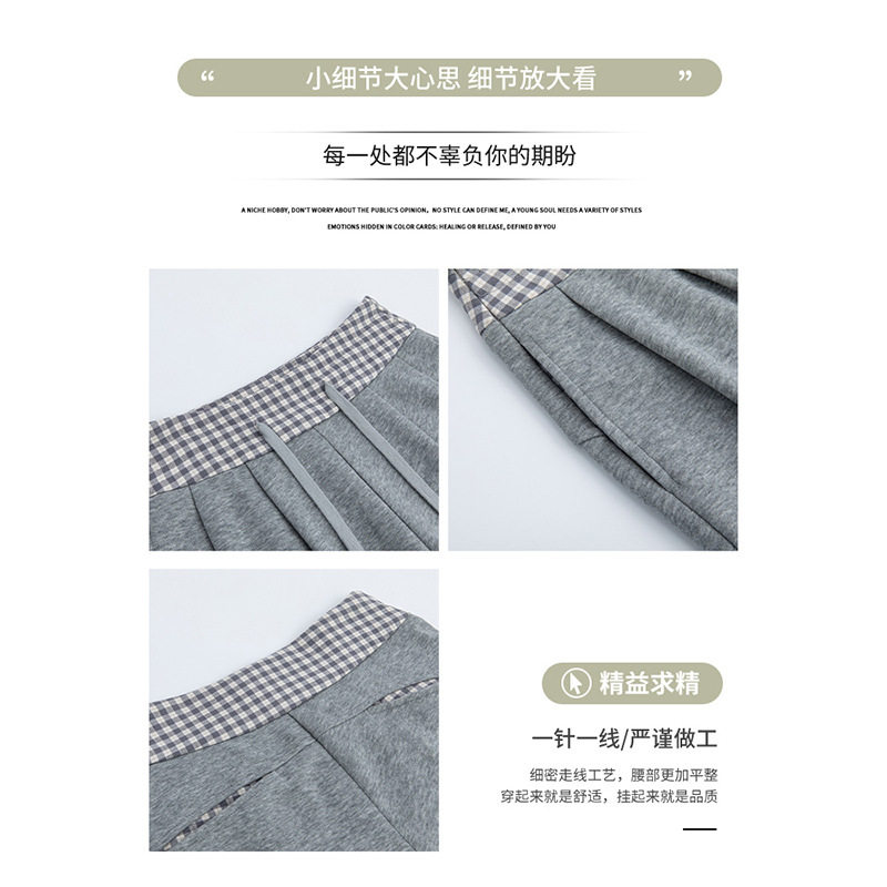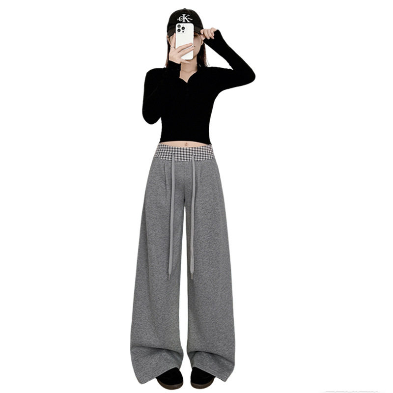灰色撞色腰格子裤子女款春季新款高腰直筒阔腿卫裤宽松美式运动裤