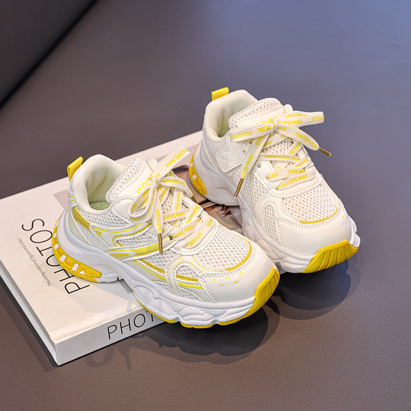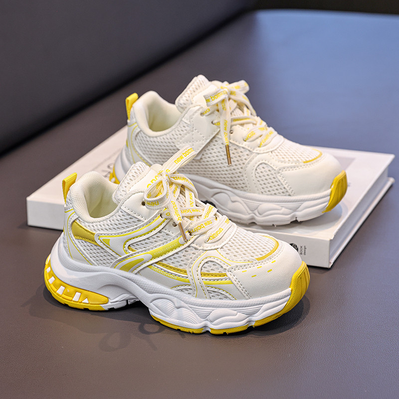女童运动风厚底老爹鞋中大童女孩百搭透气网面休闲鞋黄白色增高鞋
