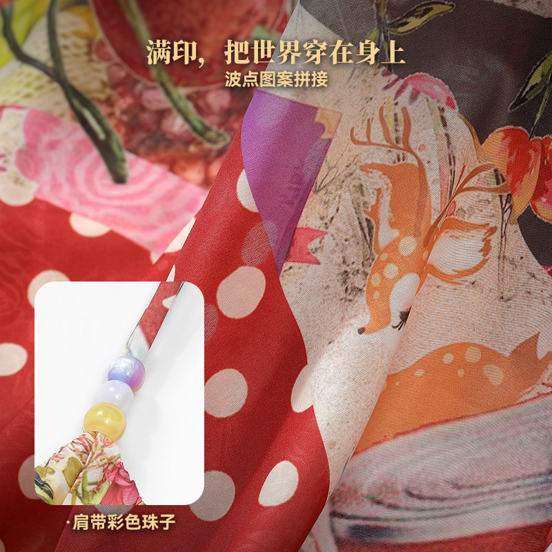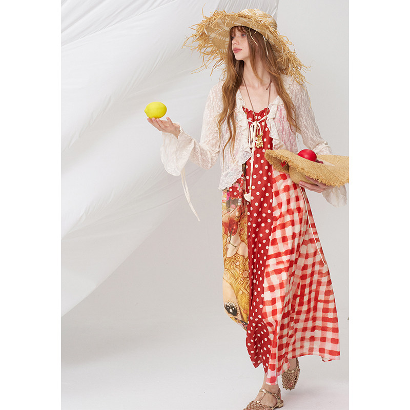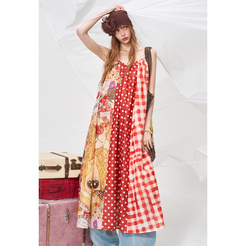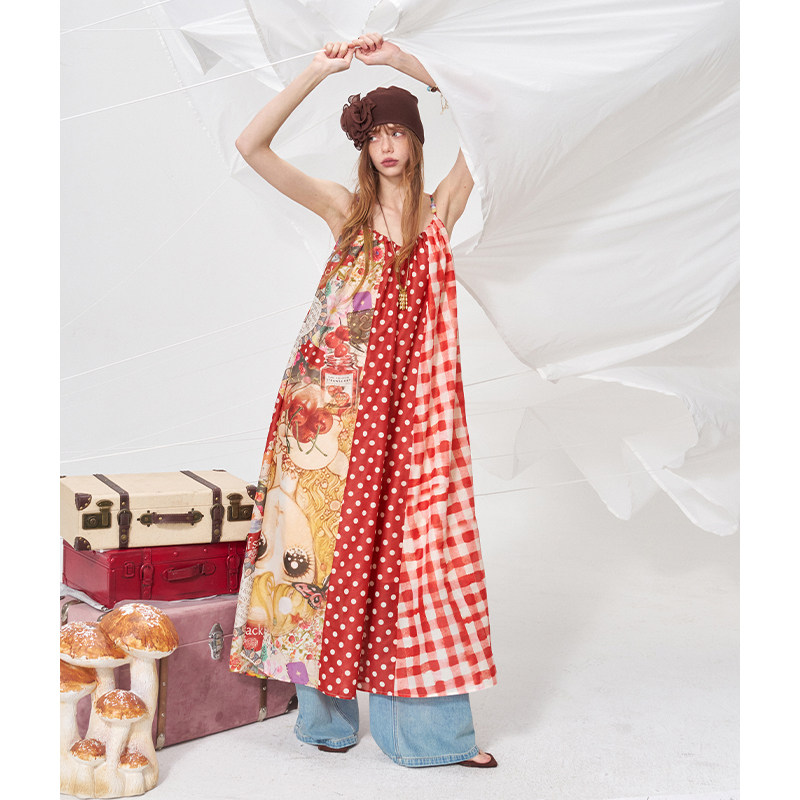 妖精的口袋原创满印波点拼接红色连衣裙女2026夏新款度假风吊带裙