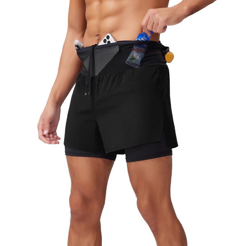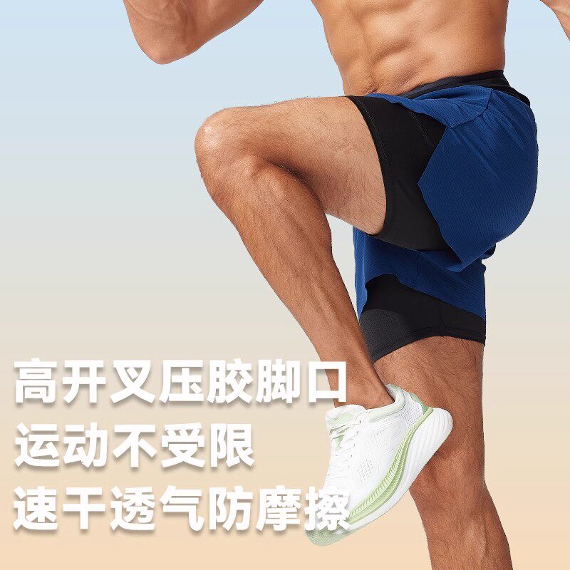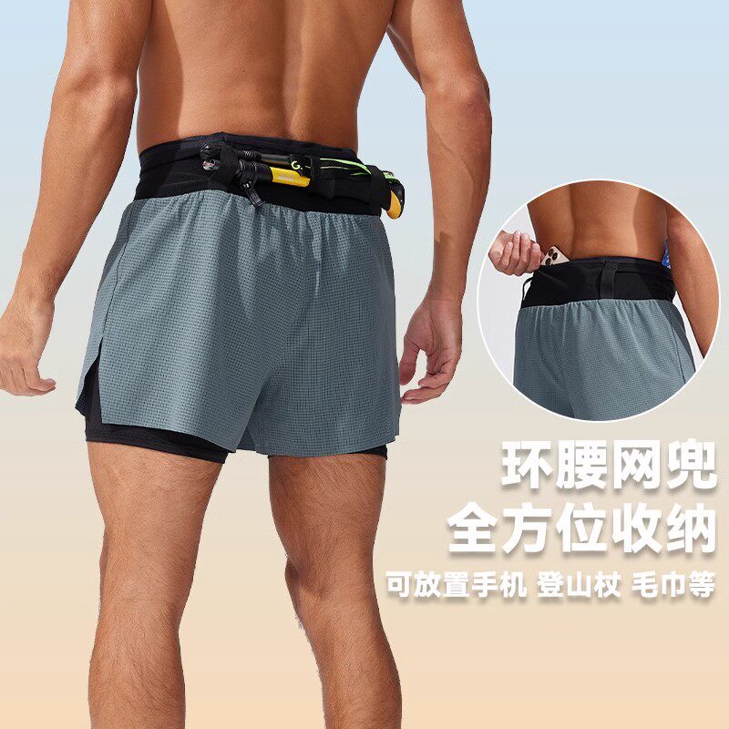 跑步运动压缩裤男马拉松健身训练速干三分裤双层假两件多腰包口袋