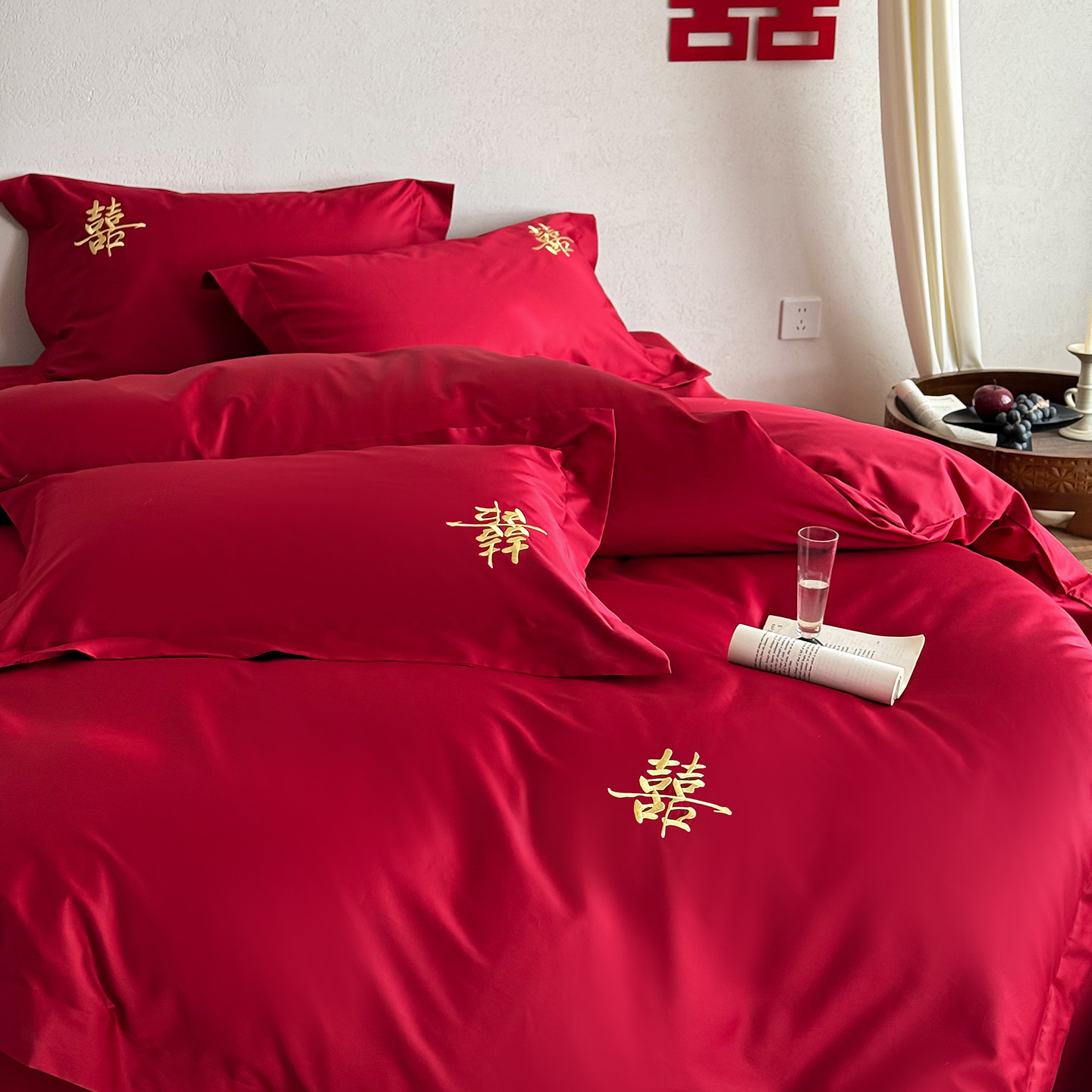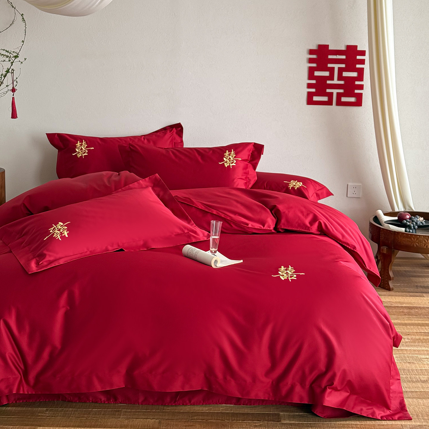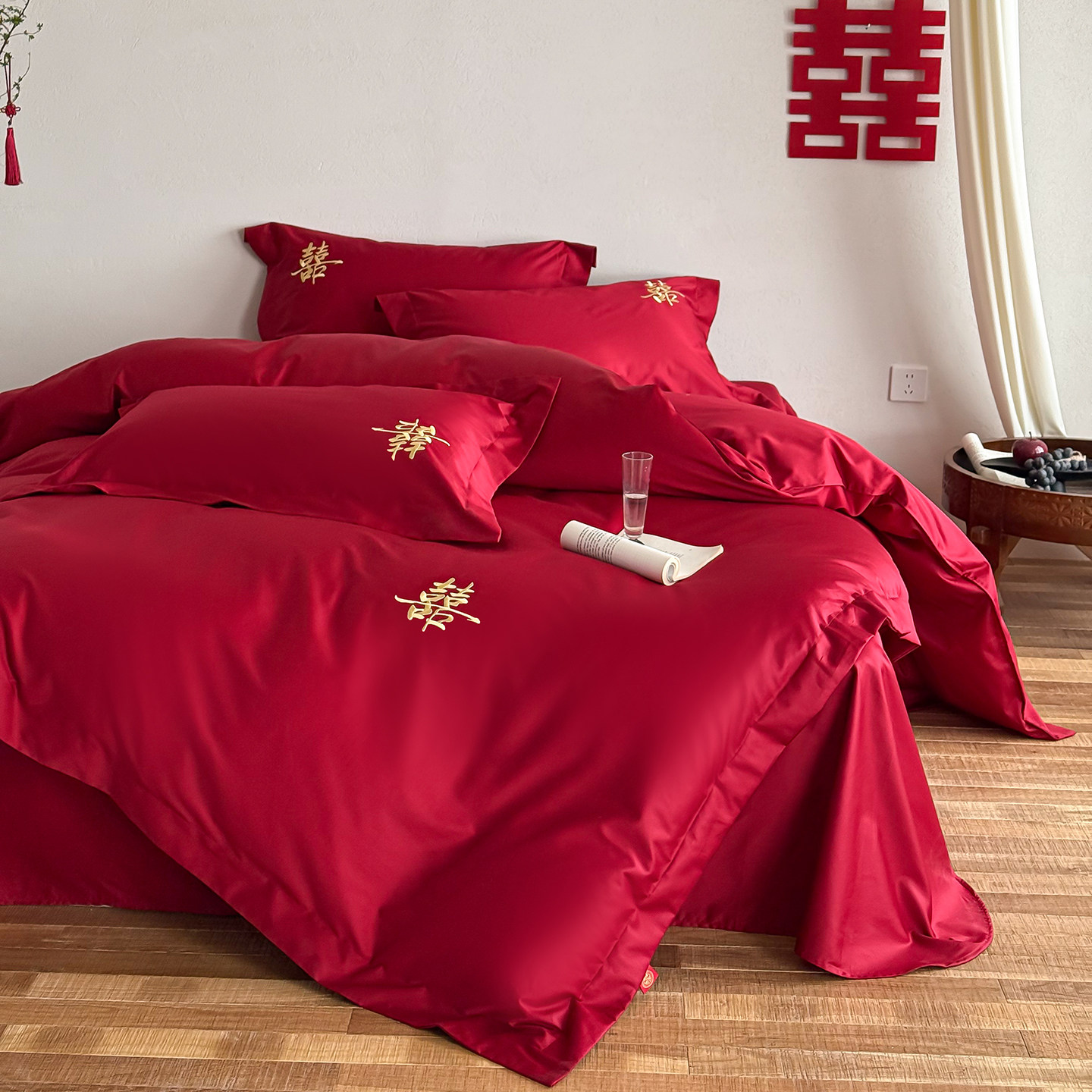 2026新款100S长绒棉四件套床上用品结婚床单喜被红色婚庆刺绣被套