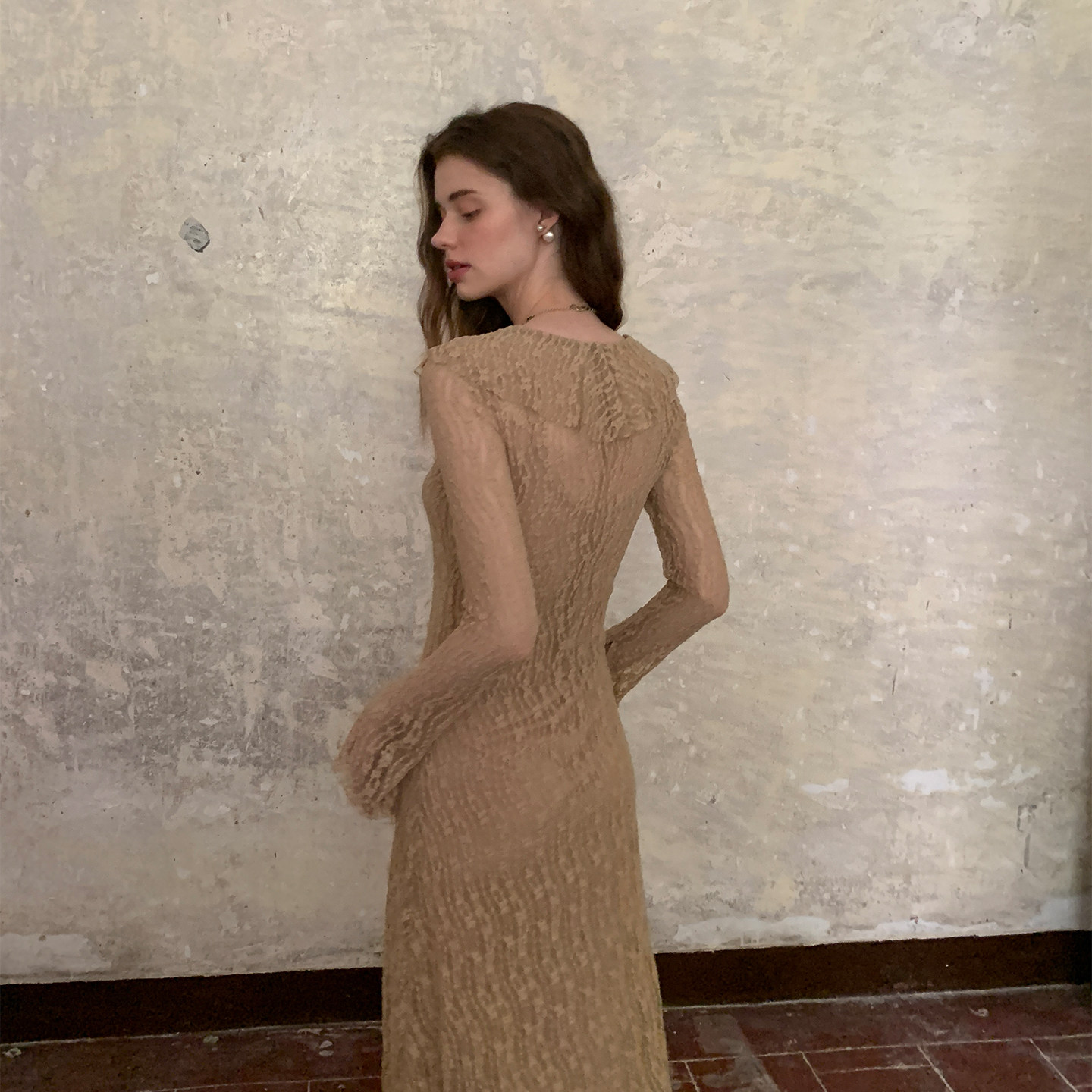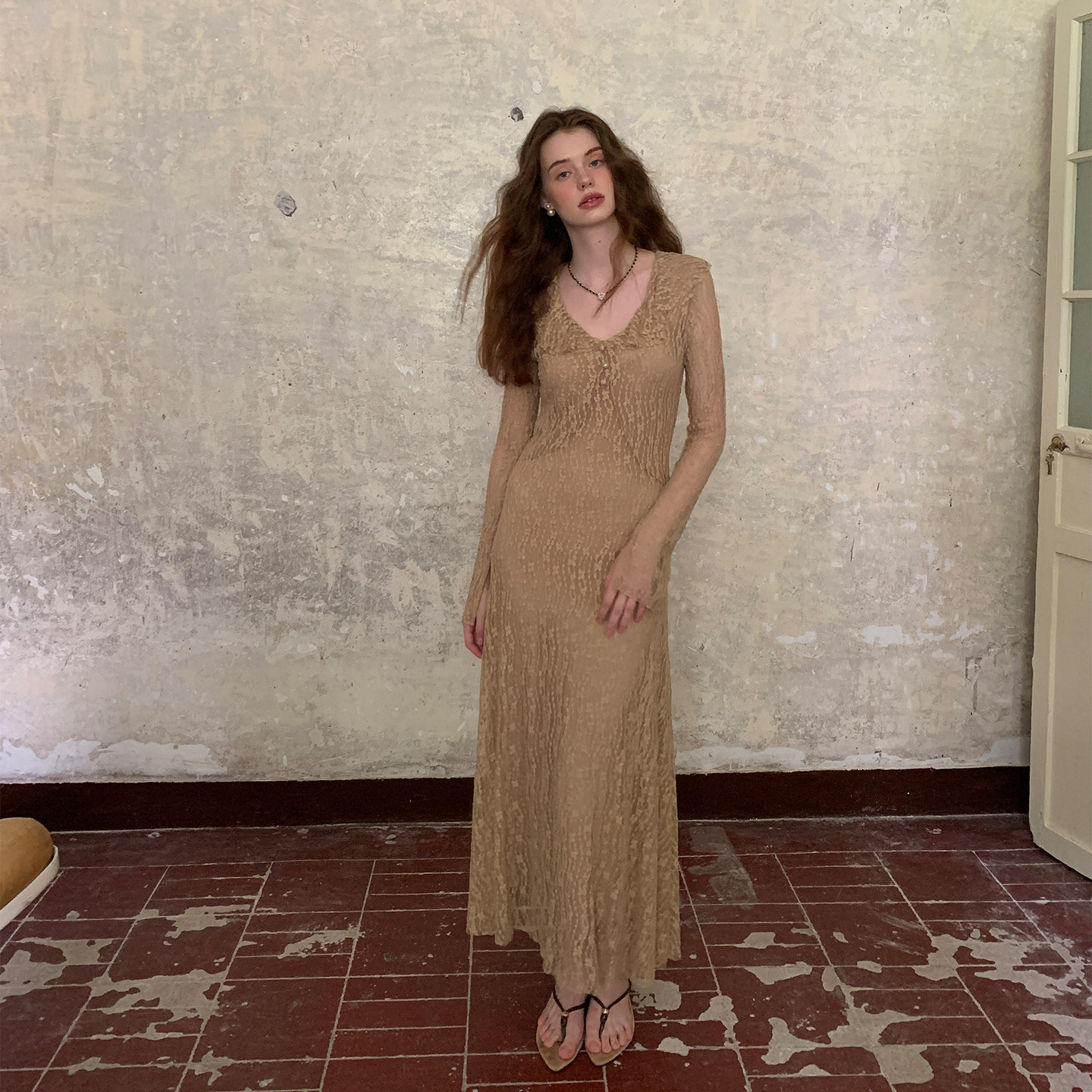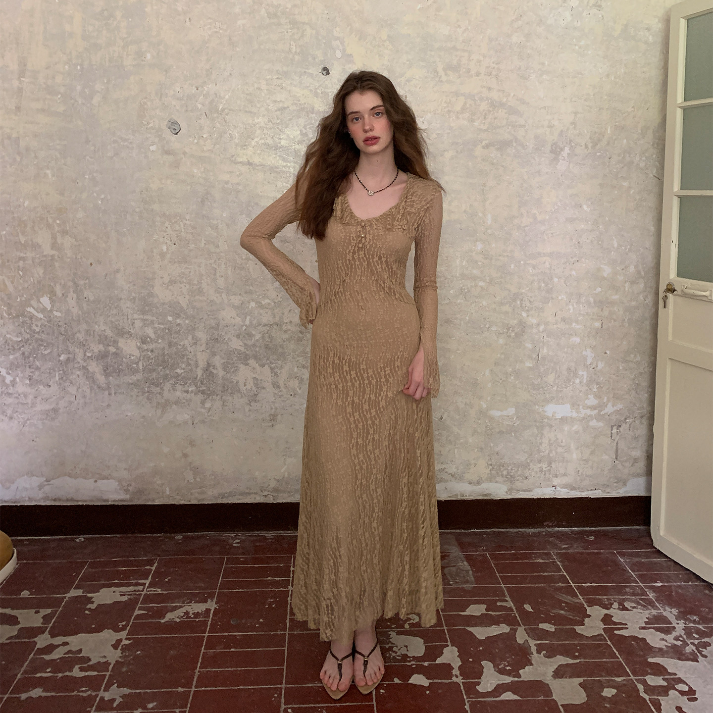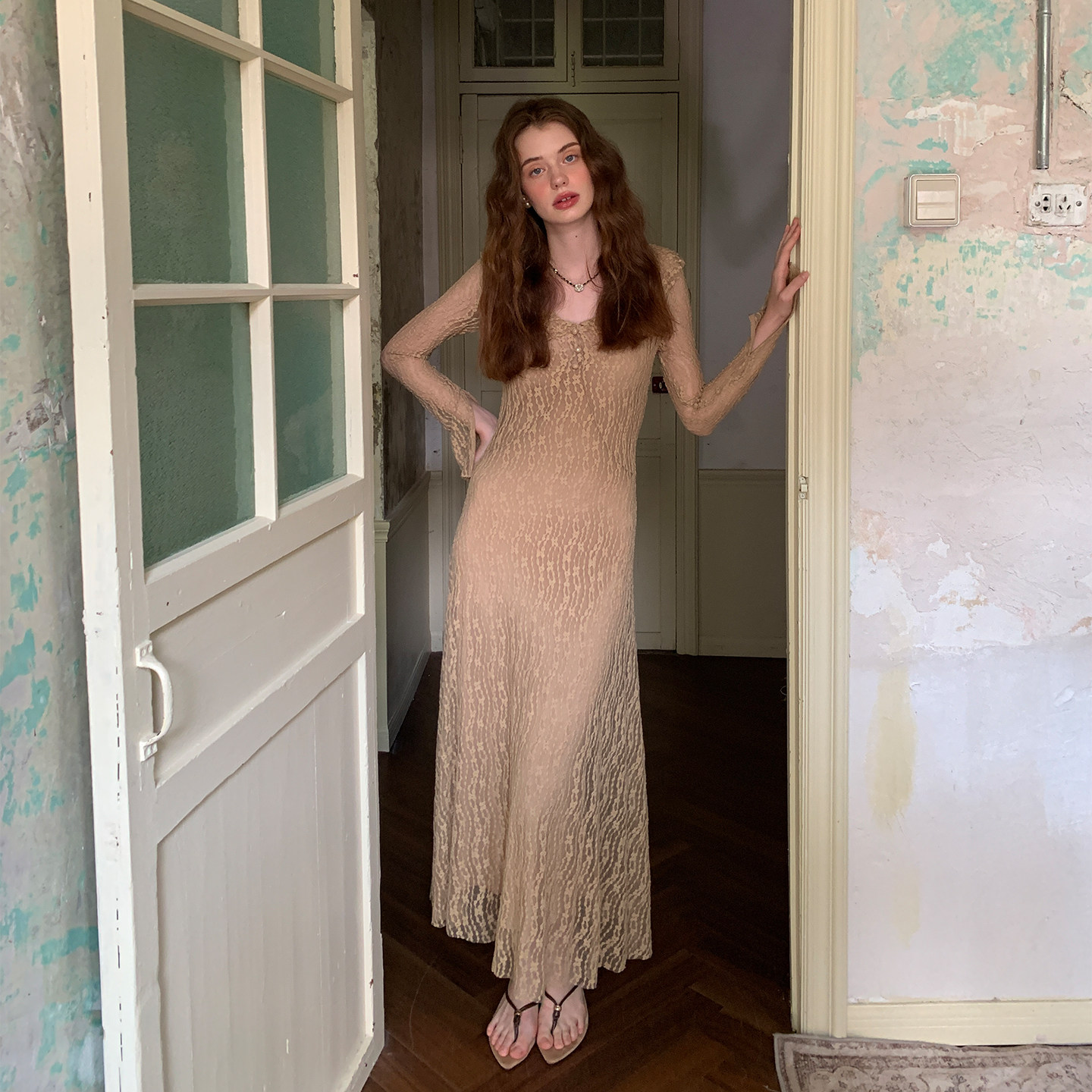 ZHUYIYI 早春新款法式蕾丝薄纱长袖春季连衣裙女原创设计简约长裙