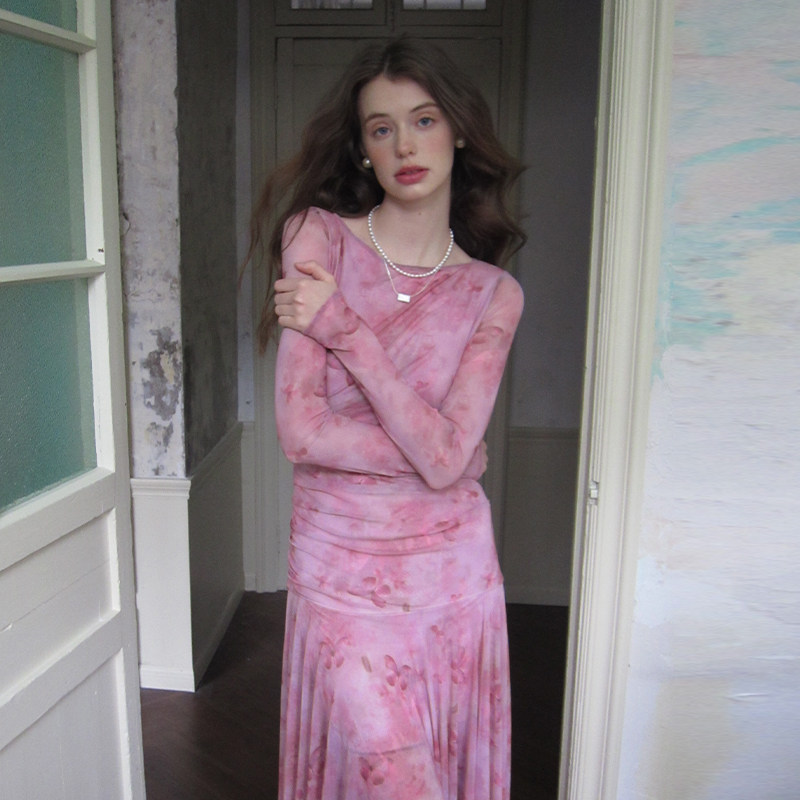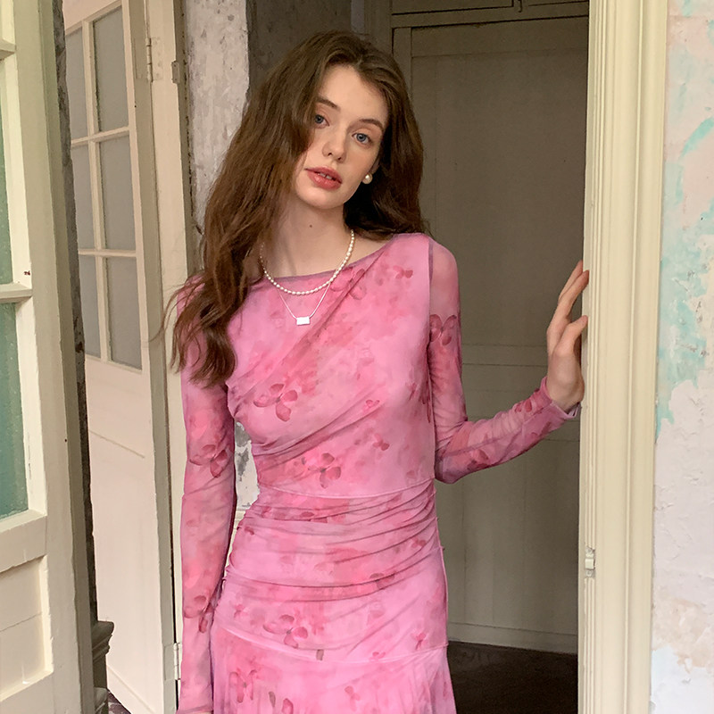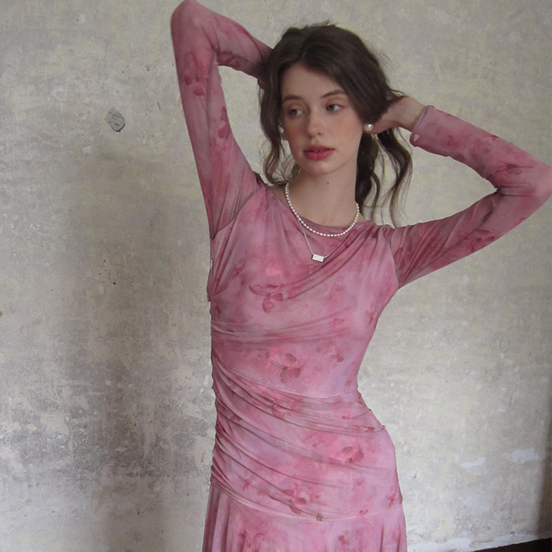 ZHUYIYI 蝴蝶印花 长袖收腰网纱薄纱春季连衣裙女长裙新款早春