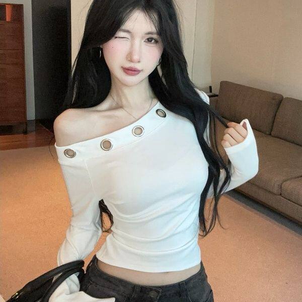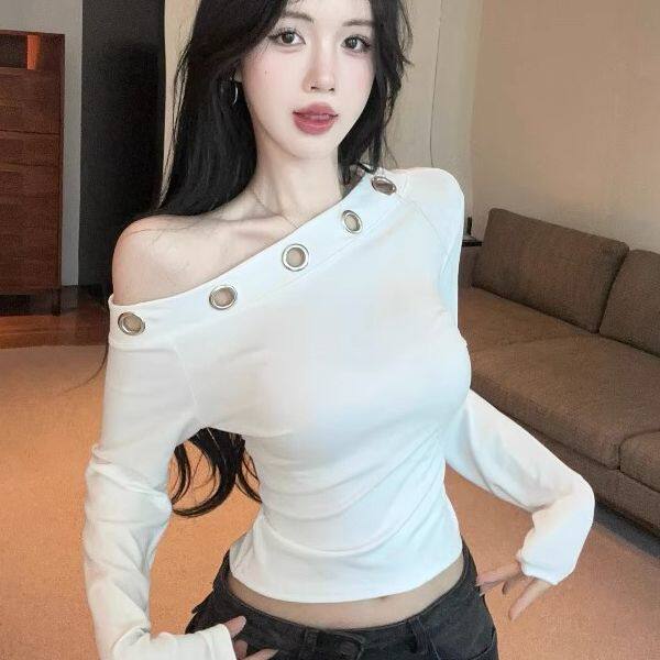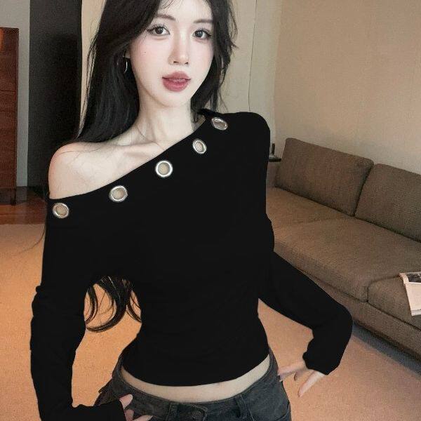 气质别致时尚一字领德绒长袖t恤秋冬新款小众设计感镂空修身上衣