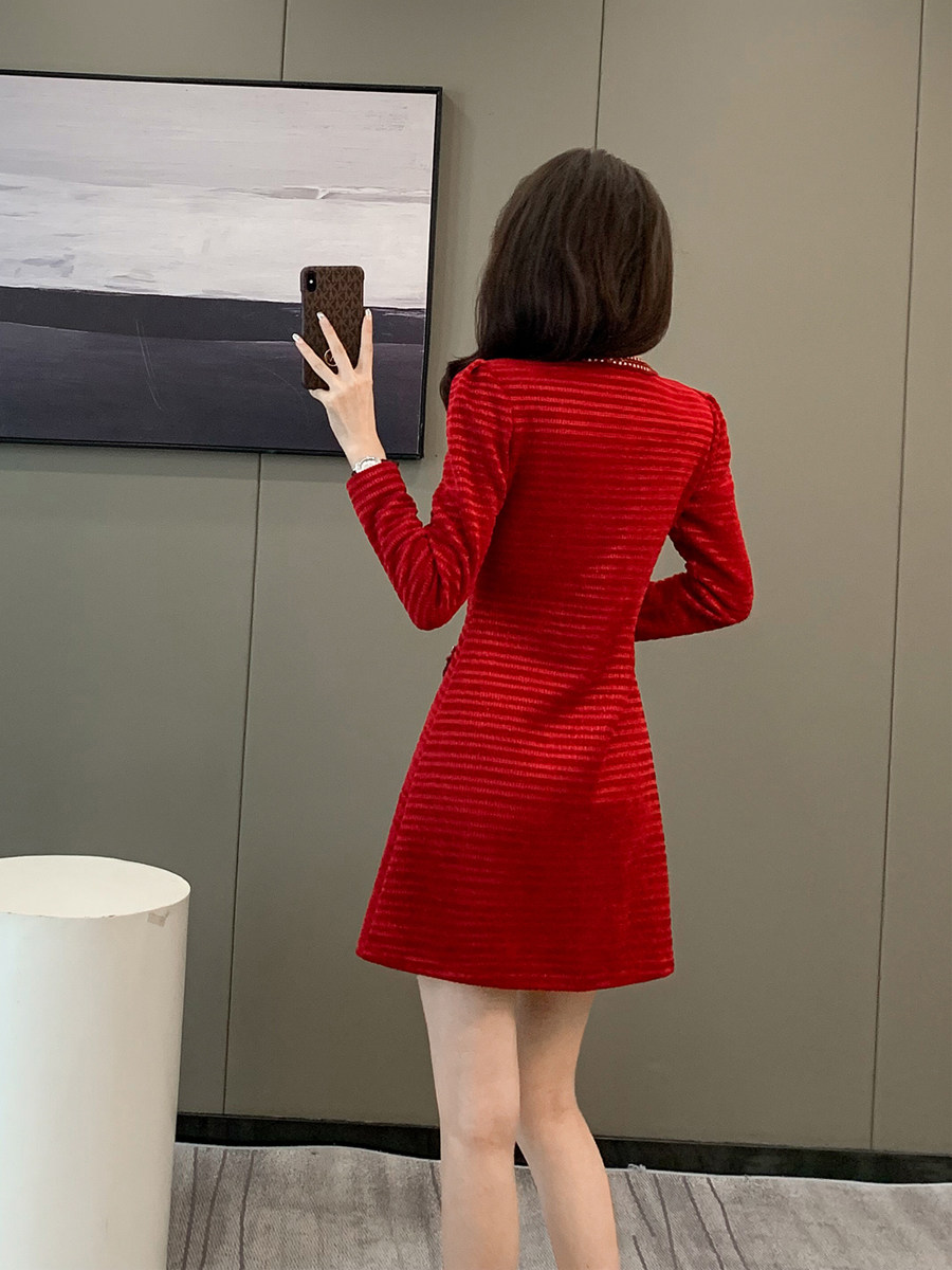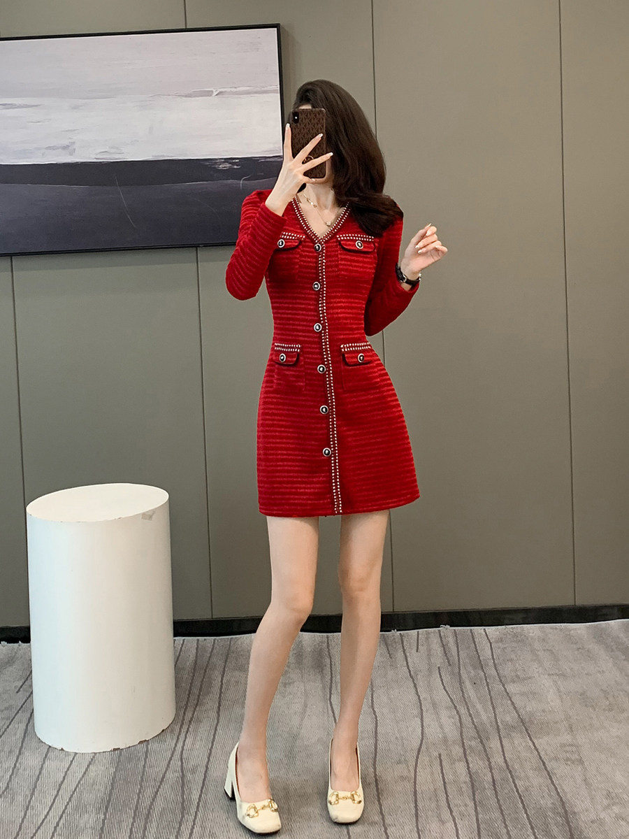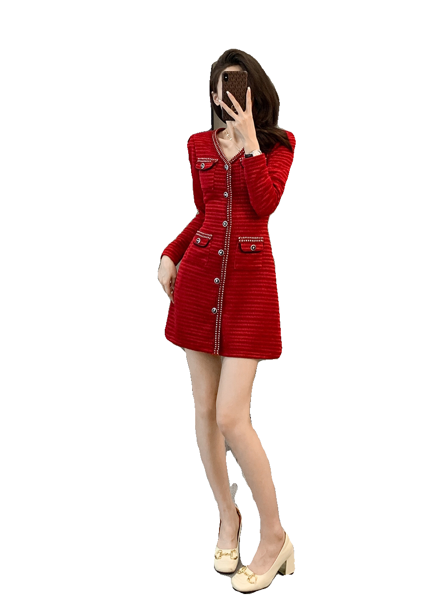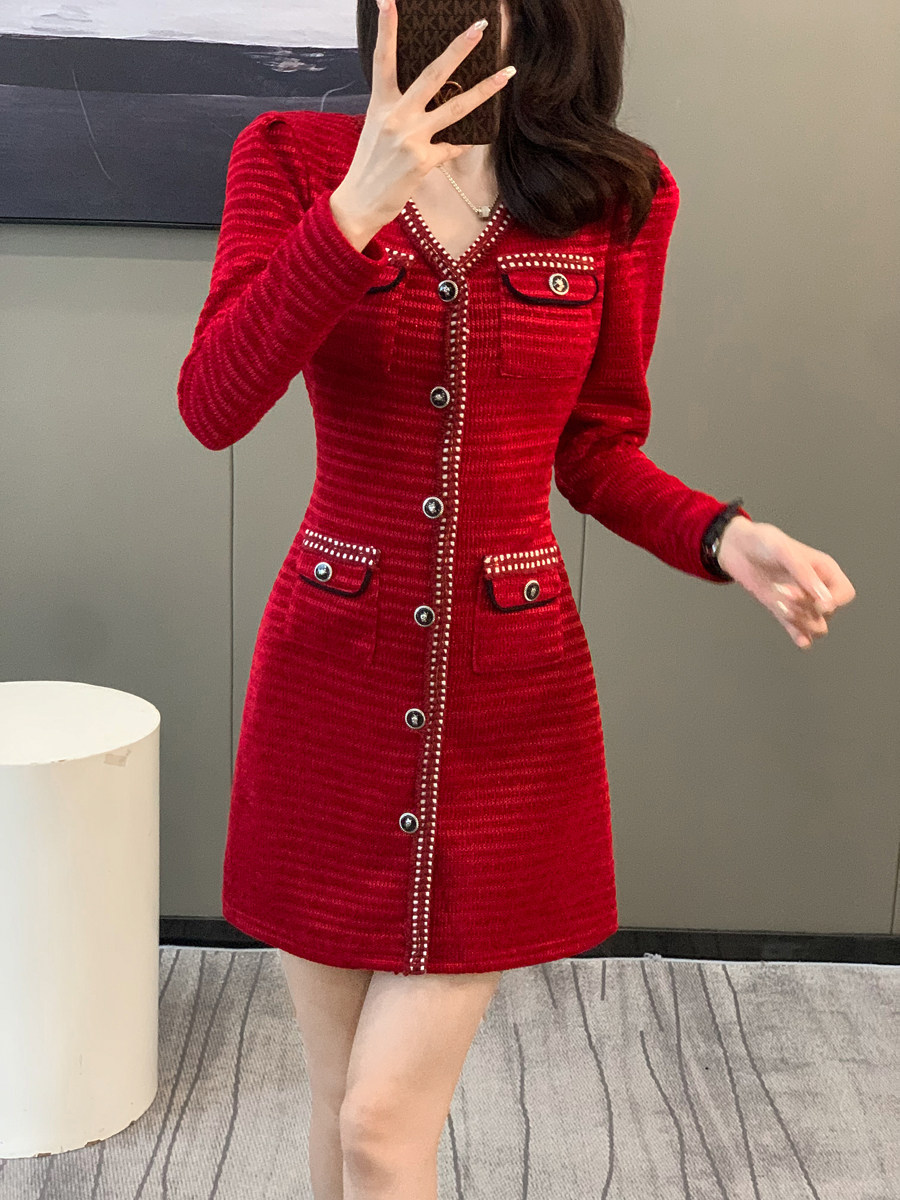 复古小香风红色针织连衣裙女小个子高级感秋冬气质名媛长袖礼服裙