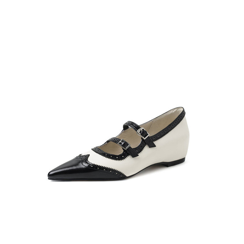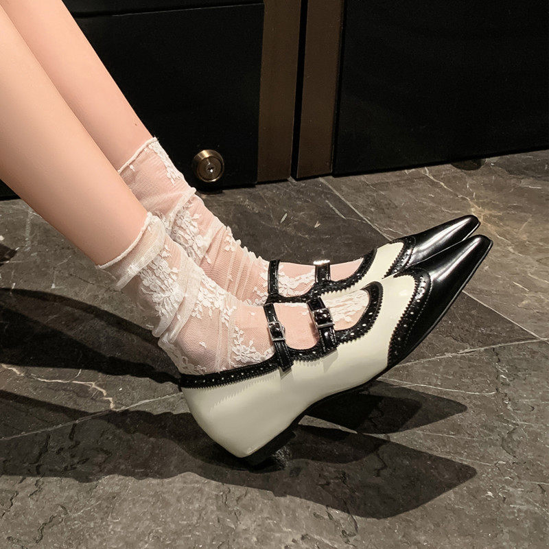 法式真皮尖头粗跟白色浅口单鞋内增高女坡跟拼色雕花百搭玛丽珍鞋