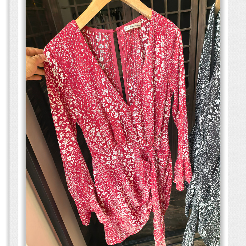 清-外单尾货长袖连衣裙 露背条纹花雪纺高腰包臀短款 甜辣妹夏季