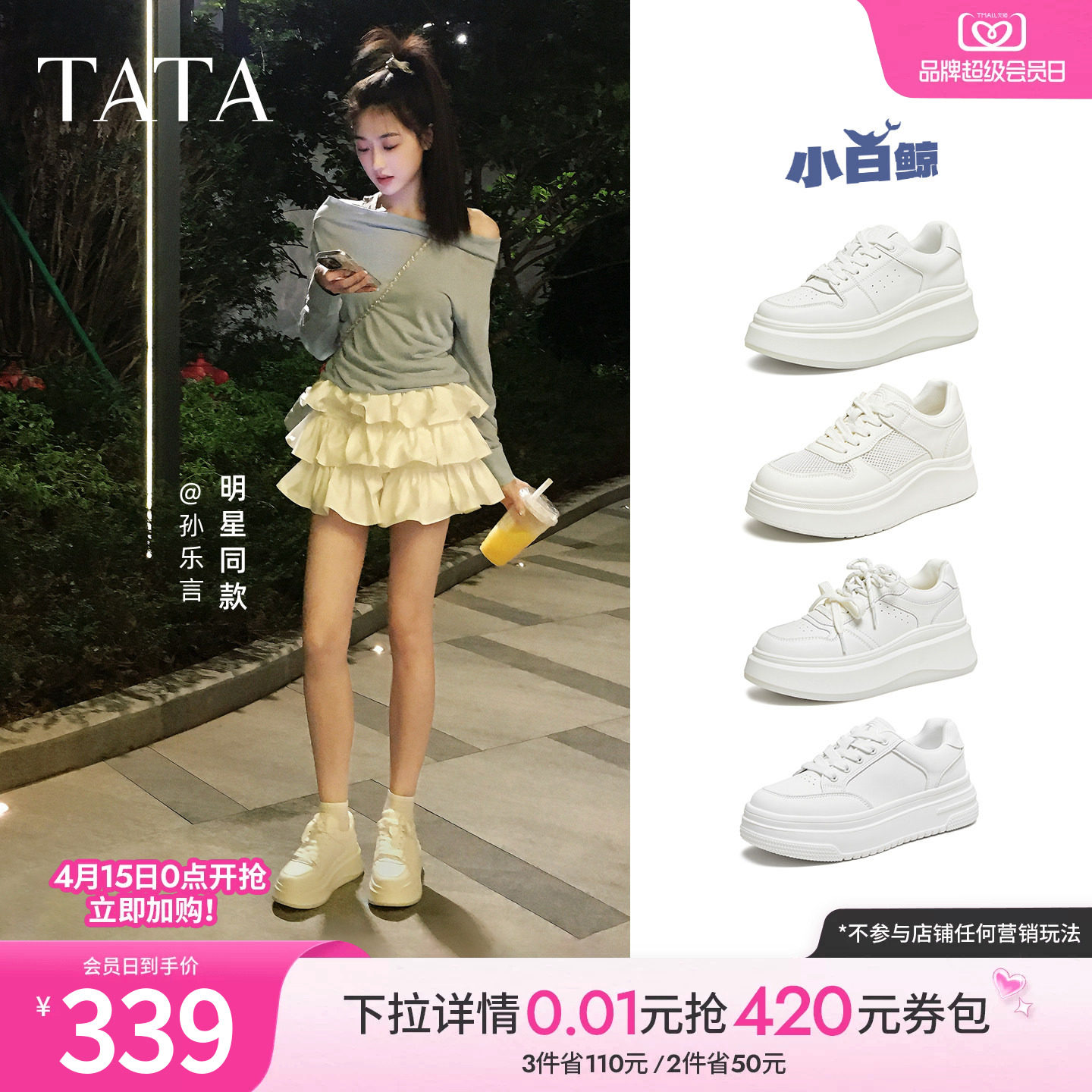孙乐言同款TATA他她女鞋小白鲸板鞋厚底百搭鞋子增高休闲款学生鞋