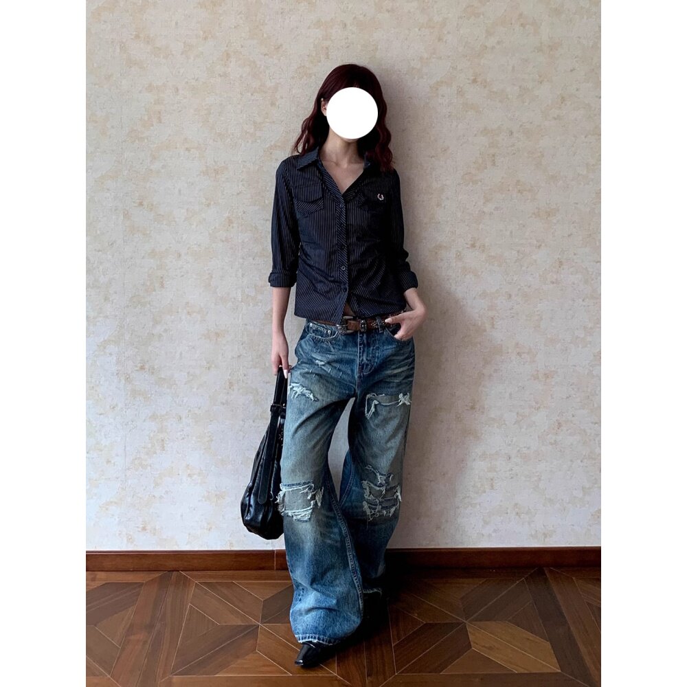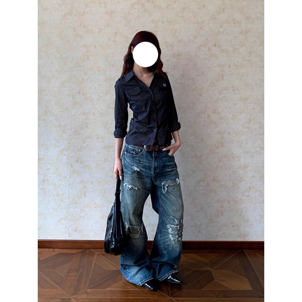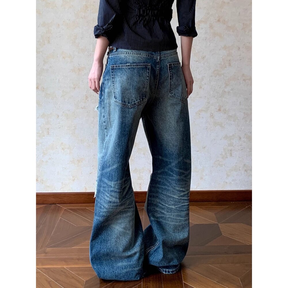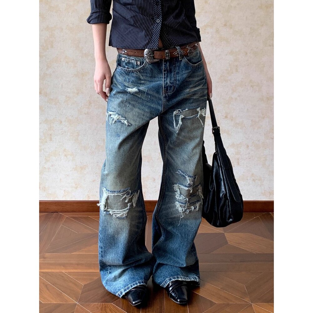 美式复古水洗补丁破洞牛仔裤男女款vintage小众痞帅宽松阔腿裤子