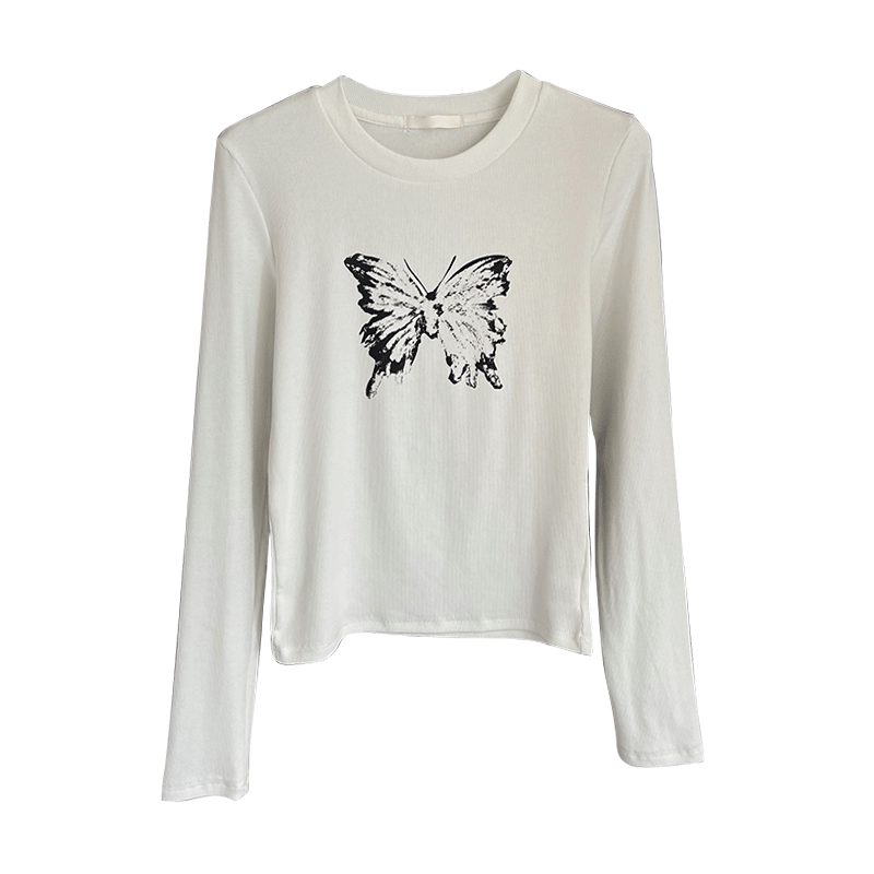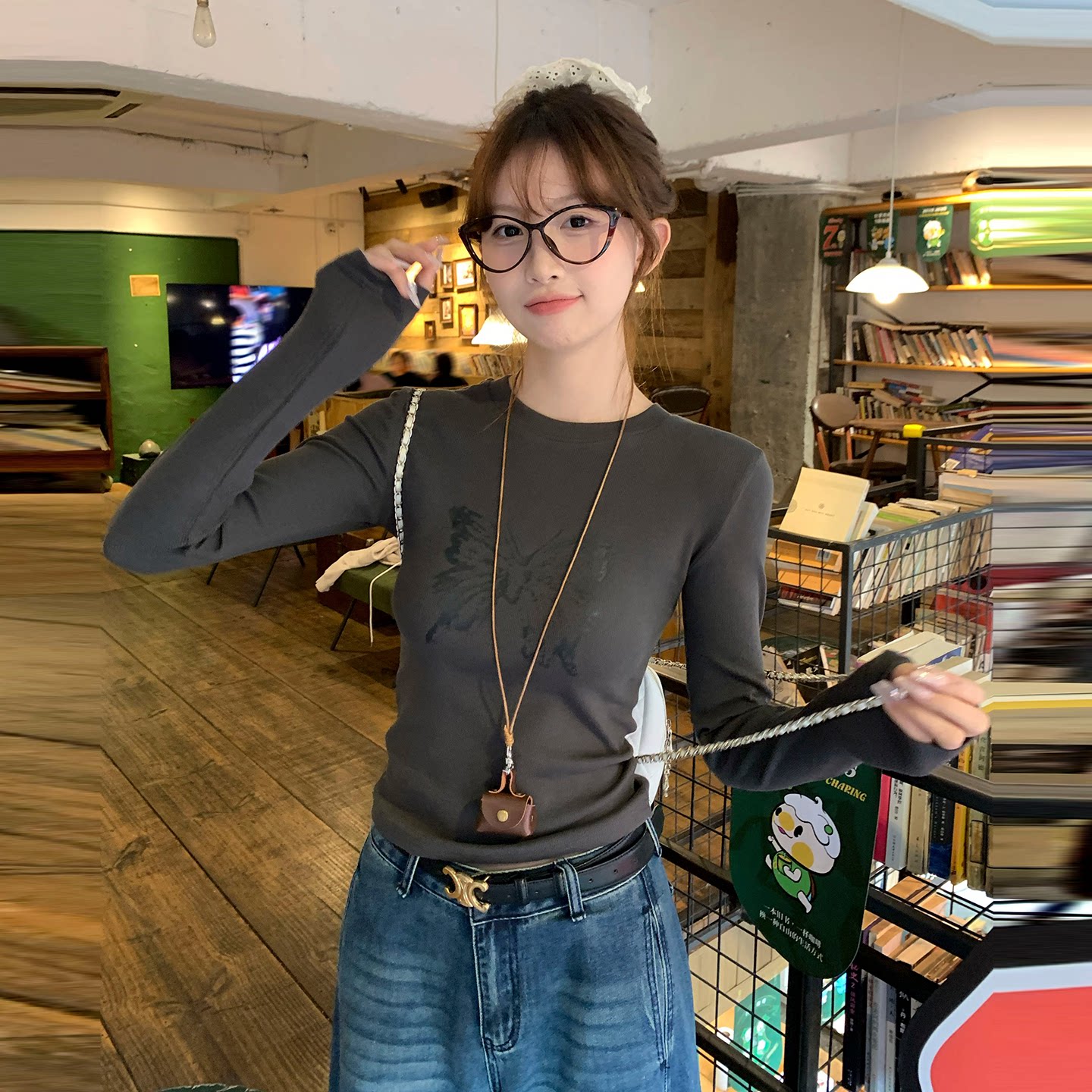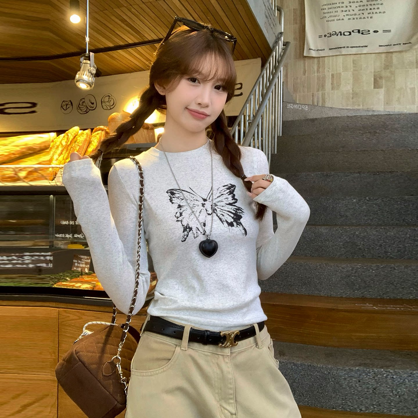 龙妹卡其色正肩长袖T恤女外穿内搭2026早春新款修身打底印花上衣
