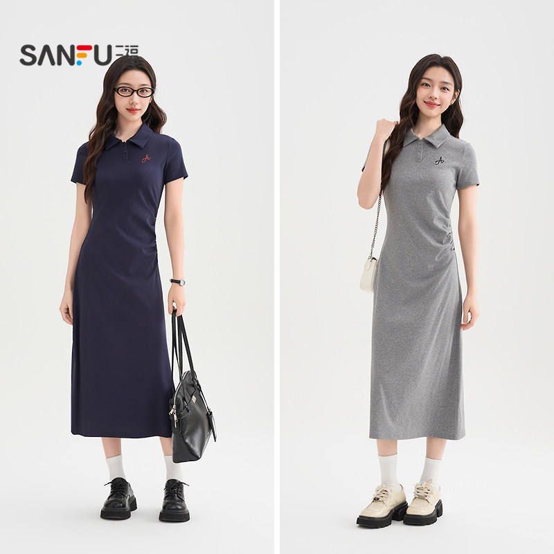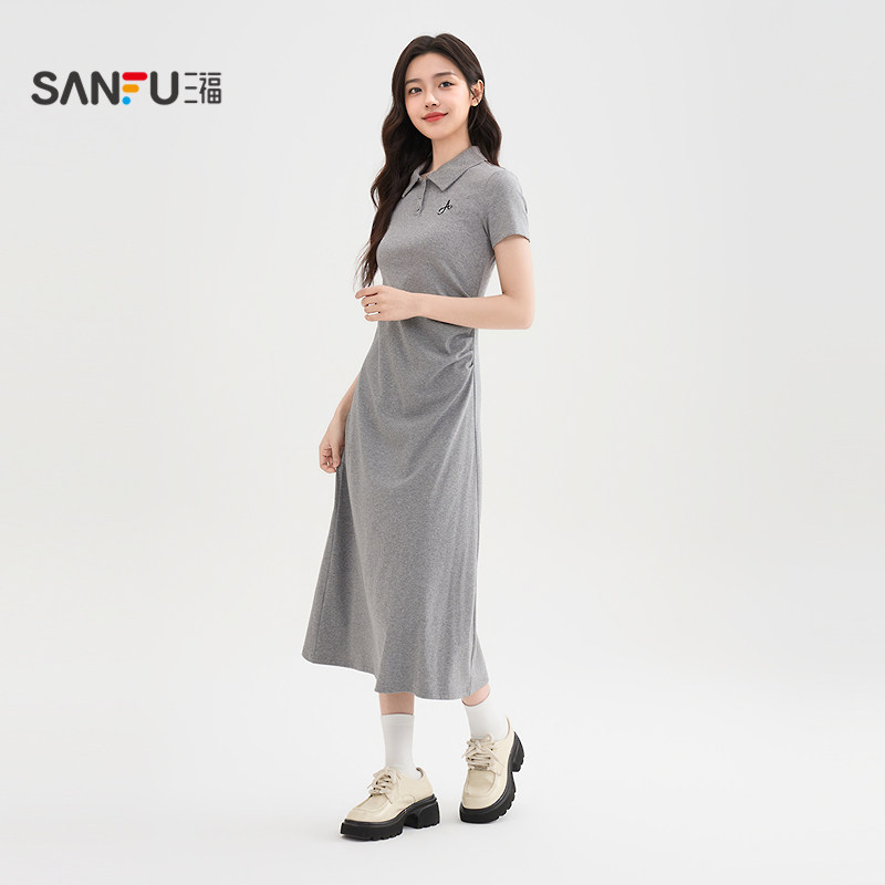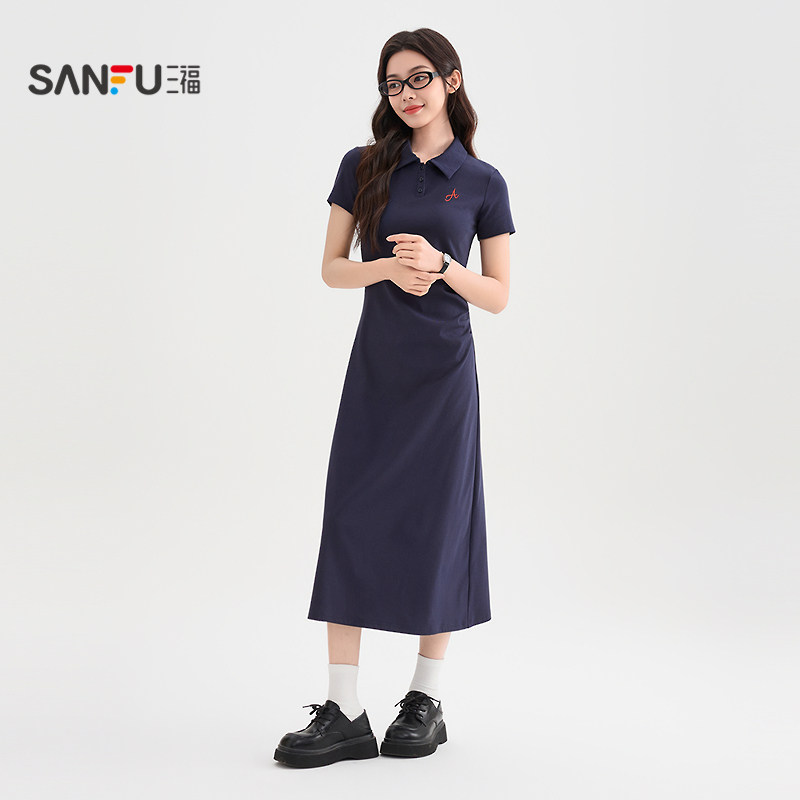 三福连衣裙2026新款夏季大方得体刺绣字母褶皱收腰Polo领裙子女装