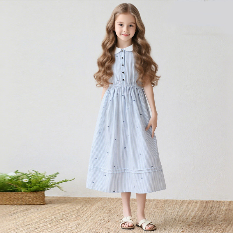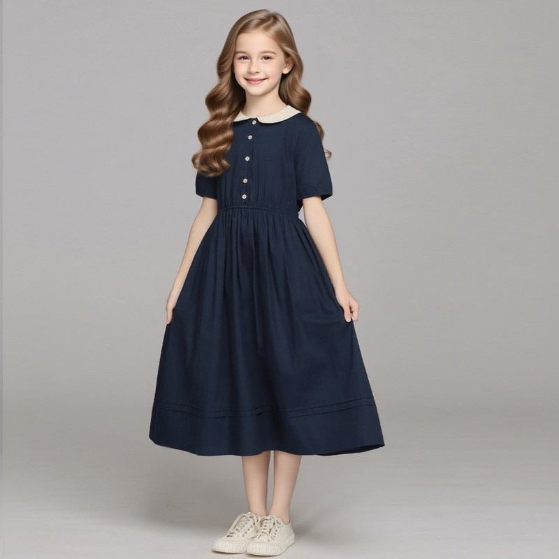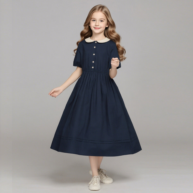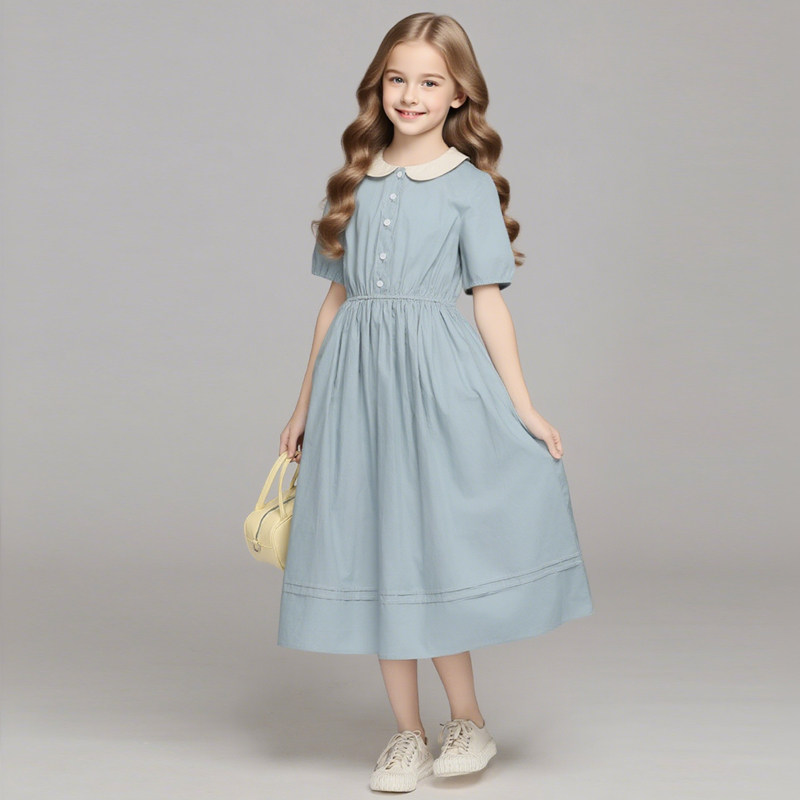 甜美棉质新款女孩儿童连衣裙夏季女童娃娃领长裙短袖初中学生裙子