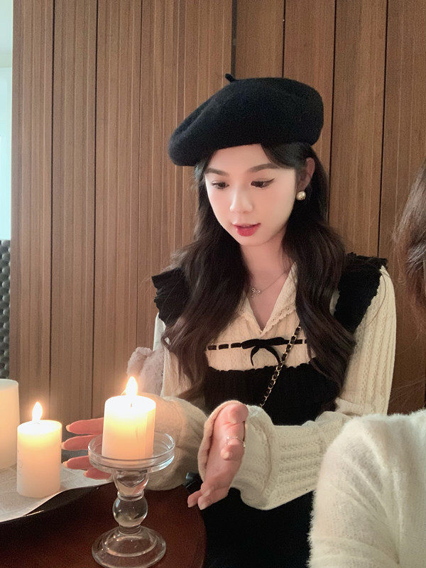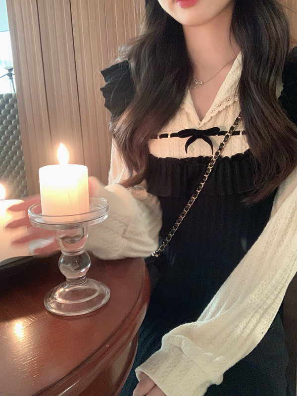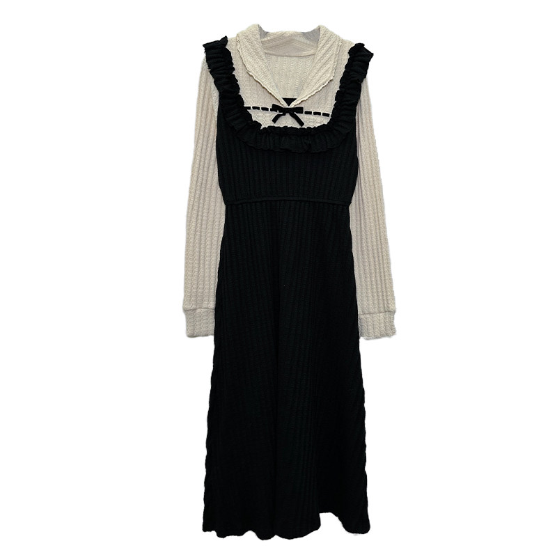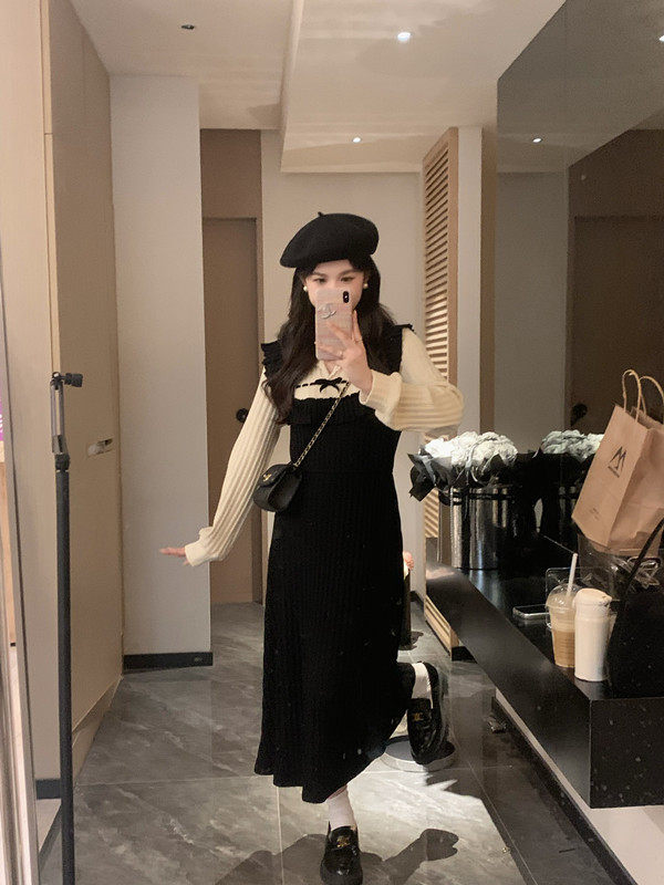 安璃 复古甜心~撞色假两件显瘦提花连衣裙长裙收腰百搭法式小黑裙