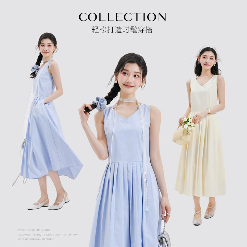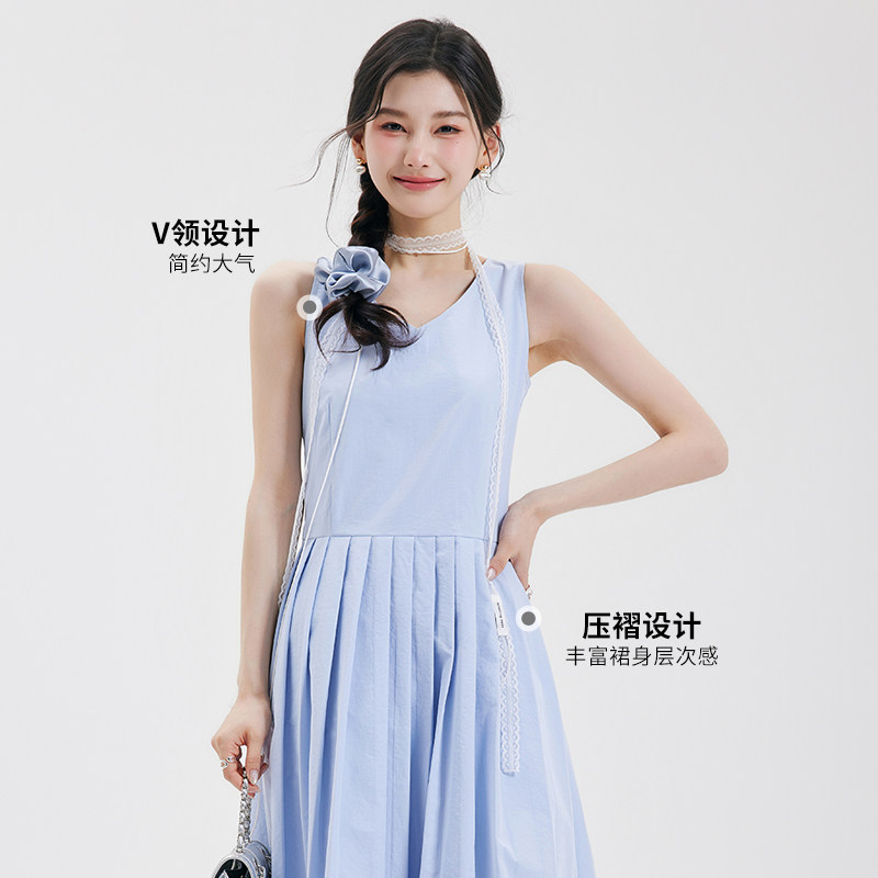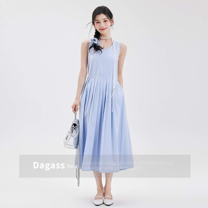 达佳诗蓝色连衣裙女士收腰V领设计长裙日常通勤夏季法式蓝裙子