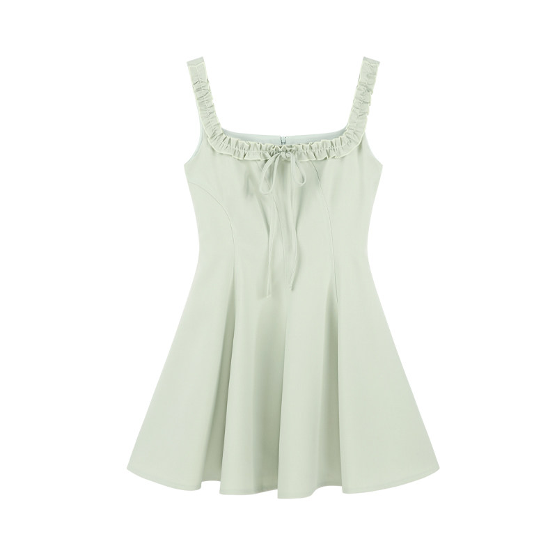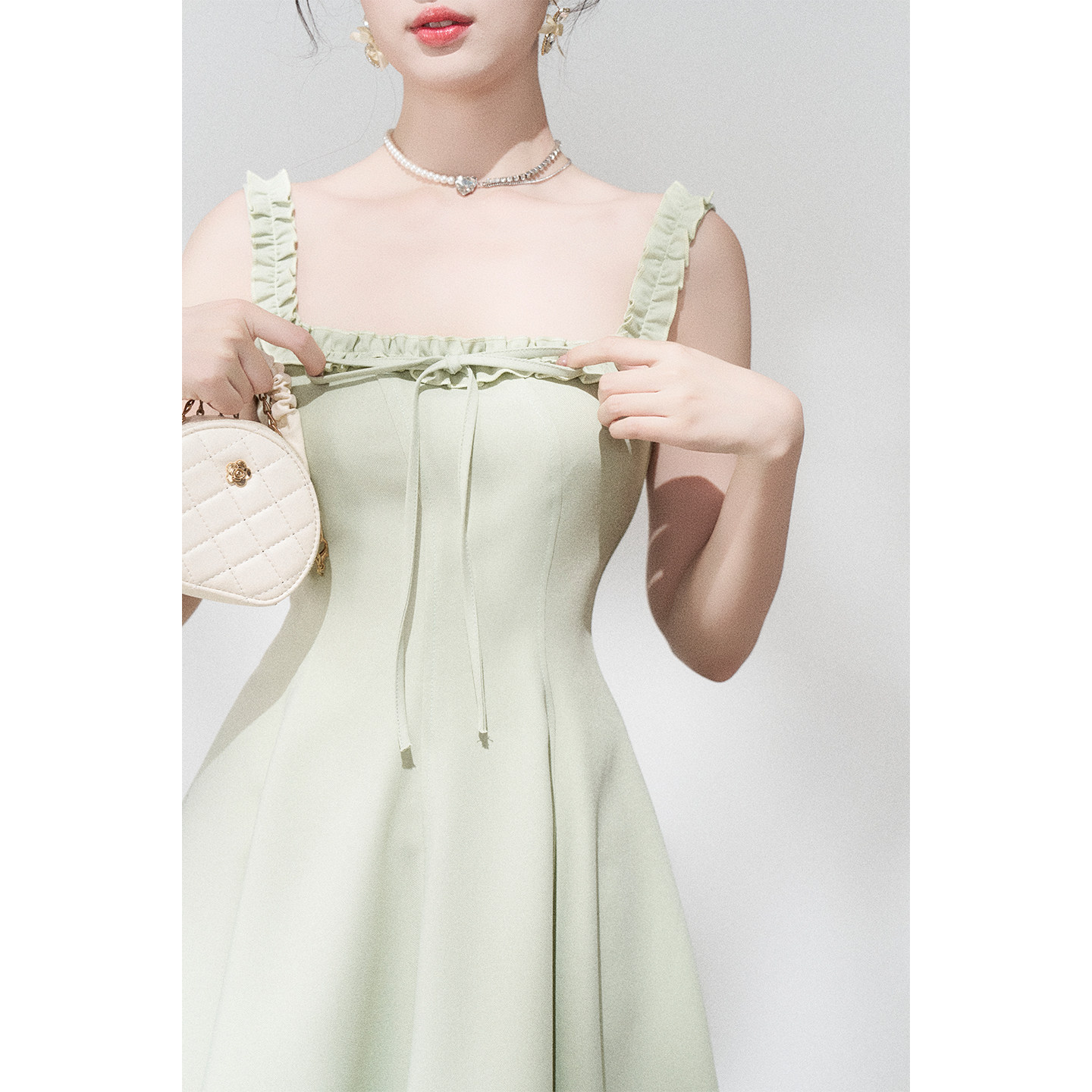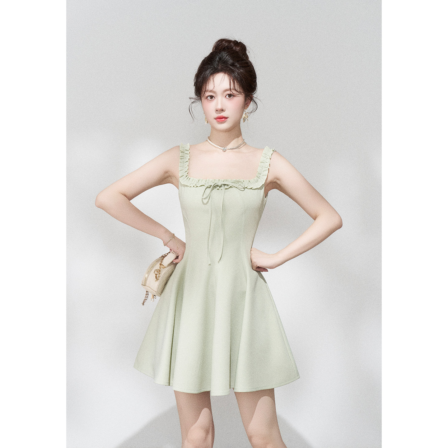 311线报网描述:芭蕾风绿色吊带方领连衣裙女夏季