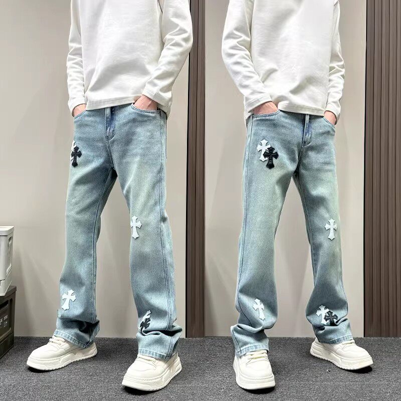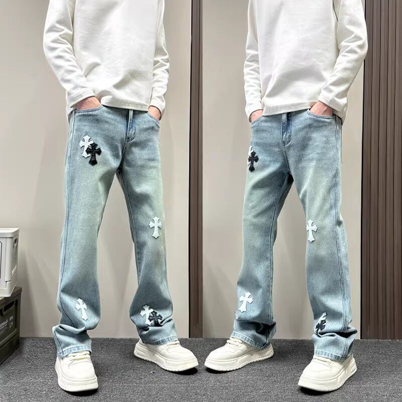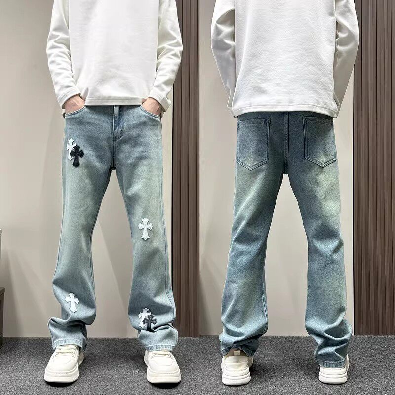 美式潮牌十字架微喇水洗蓝色牛仔裤男款cleanfit春秋直筒休闲裤子