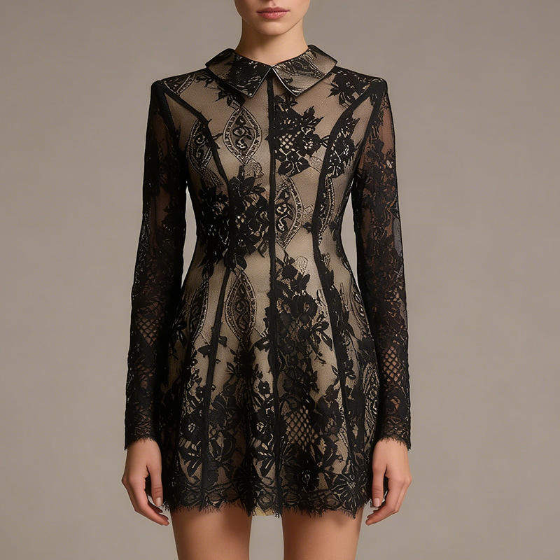 新款复古轻熟风连衣裙 2026衬衫领长袖收腰显瘦透视蕾丝短款A字裙