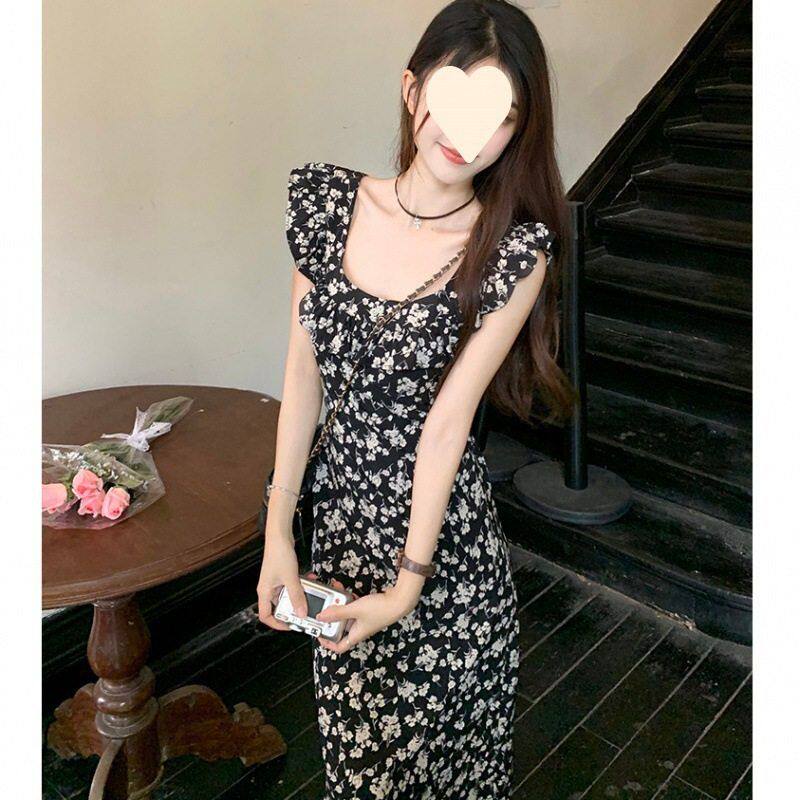 黑色碎花连衣裙女夏季2025新款裙子气质高级感a字收腰显瘦中长裙