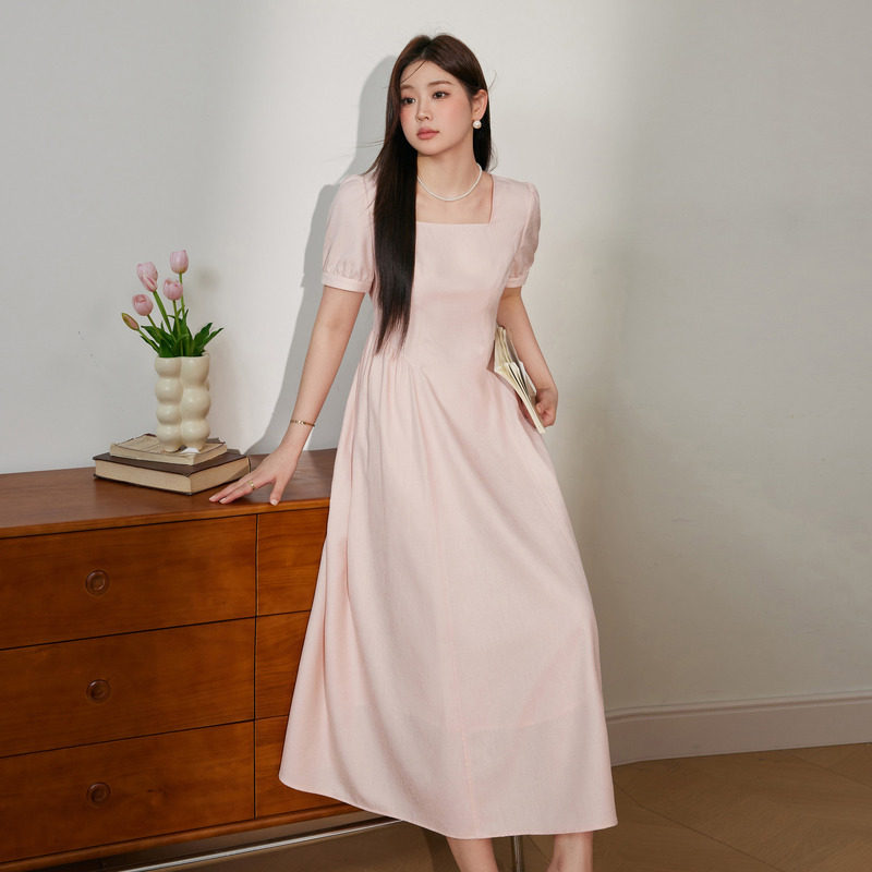 蓝语大码女装胖mm法式方领粉色连衣裙夏季新款收腰显瘦海边a字裙