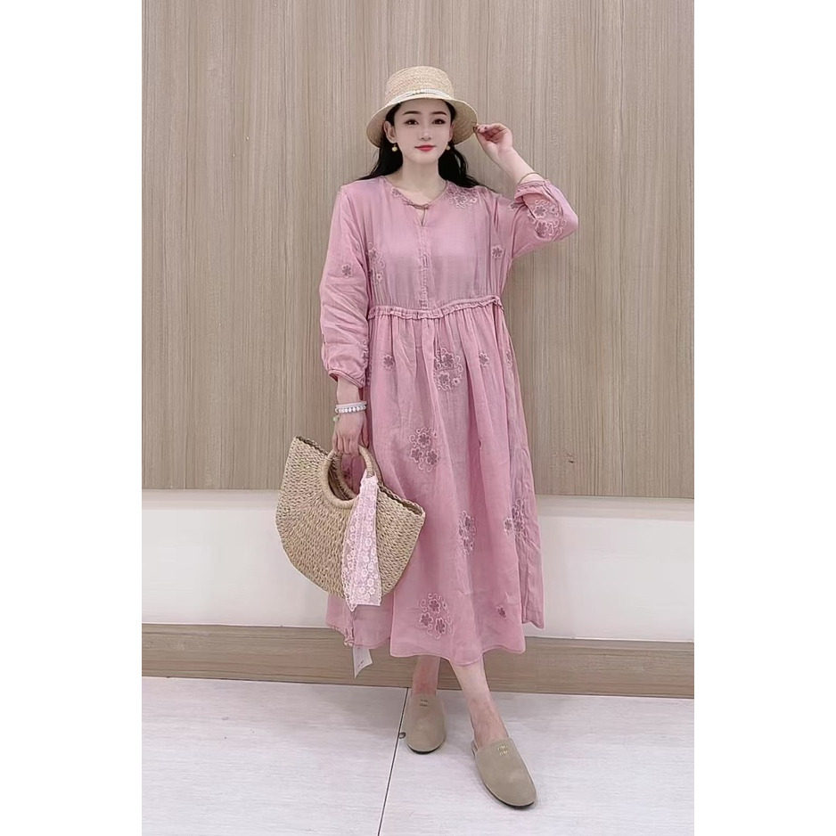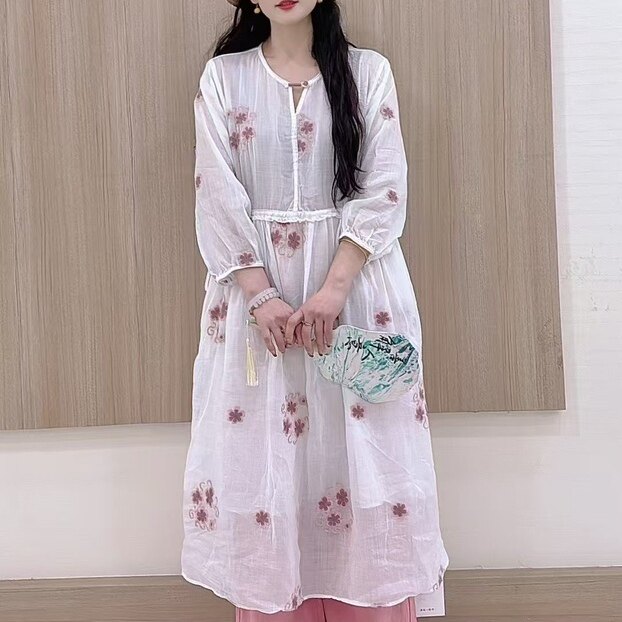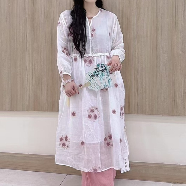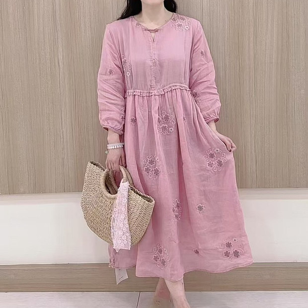22619麻印`清冷风盘扣苎麻长袖连衣裙女长款飘逸大摆茶服禅静袍子