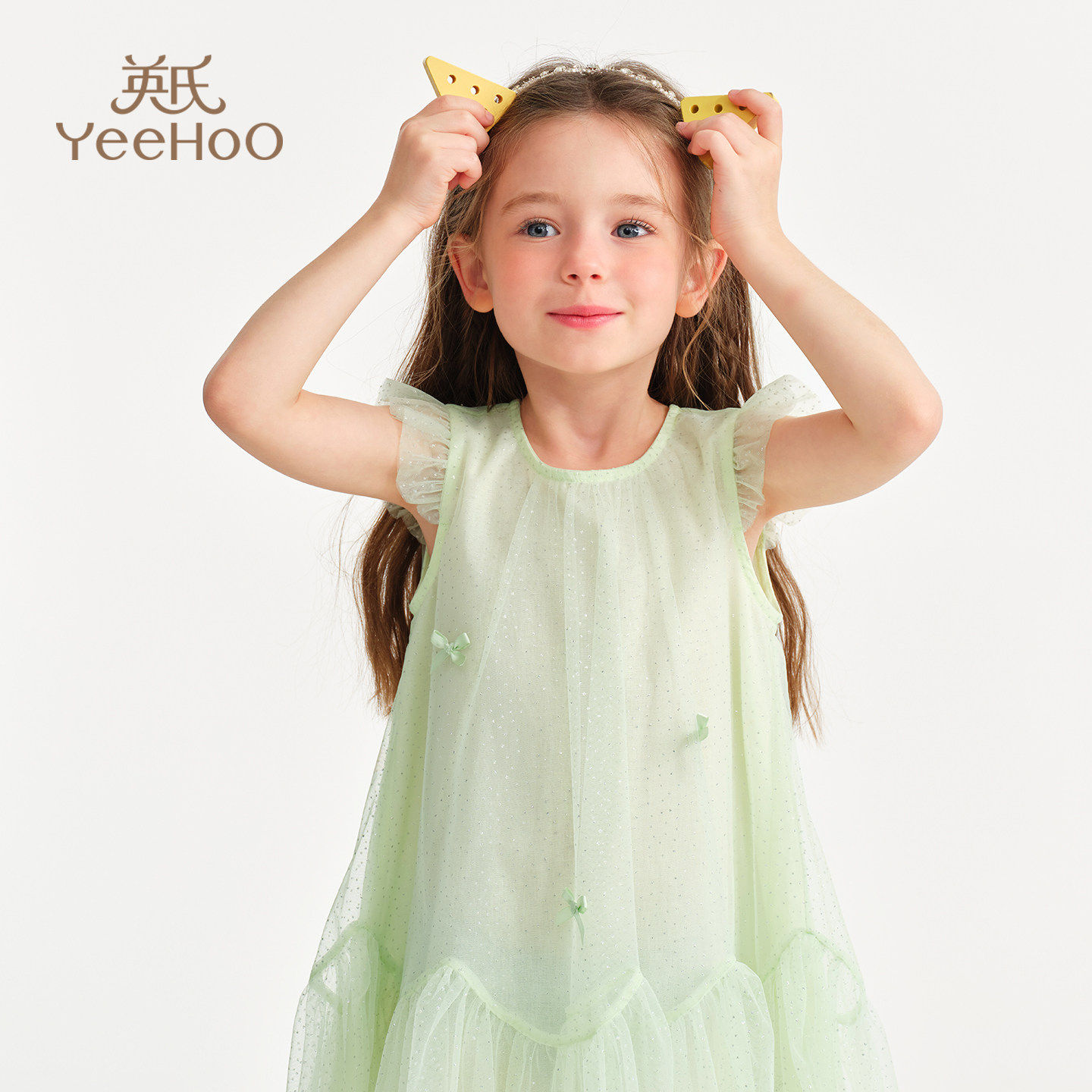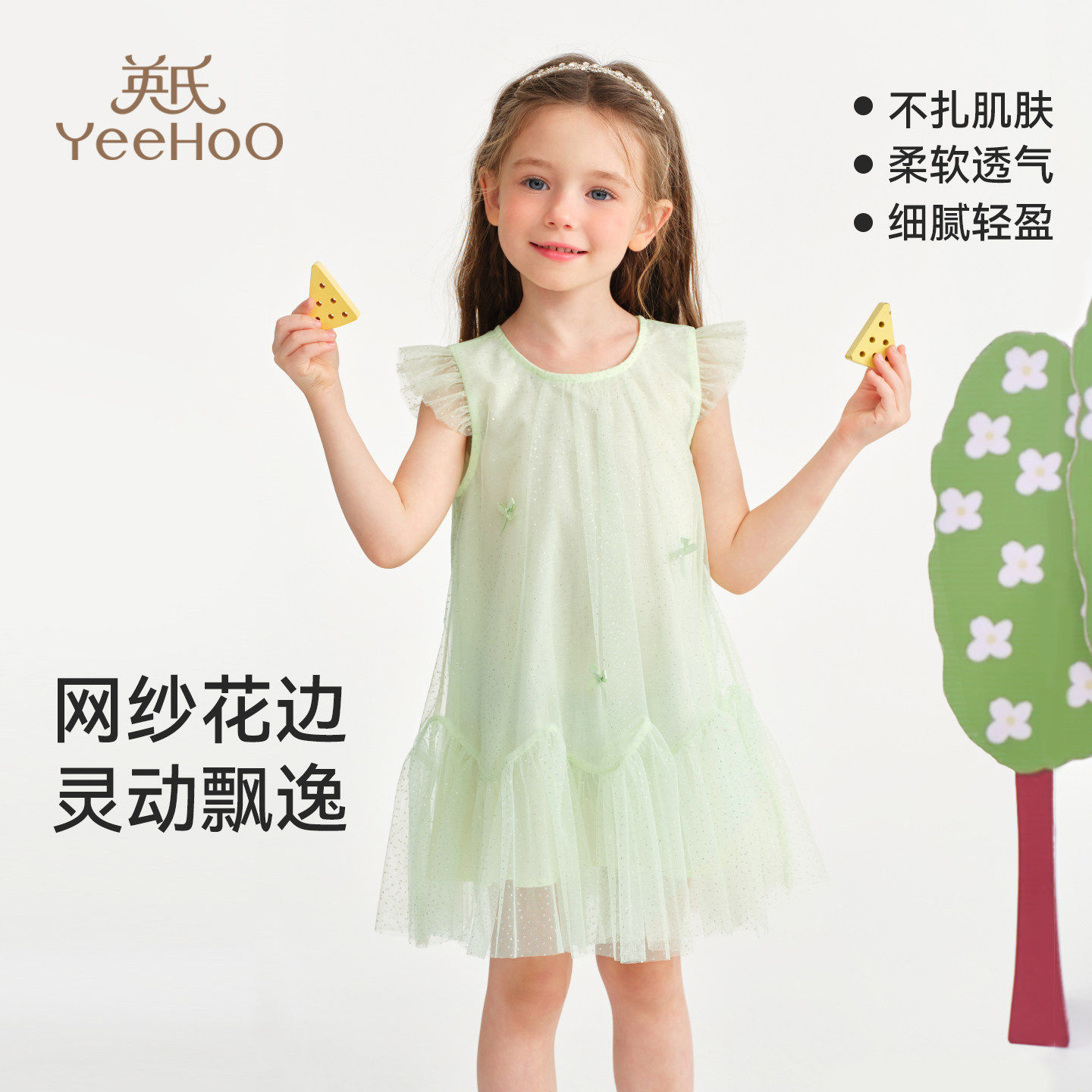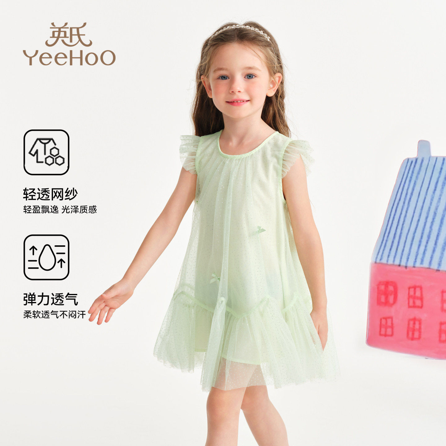 英氏乐尚女童网纱连衣裙2026年夏新款A字版圆领小飞袖超好看裙子