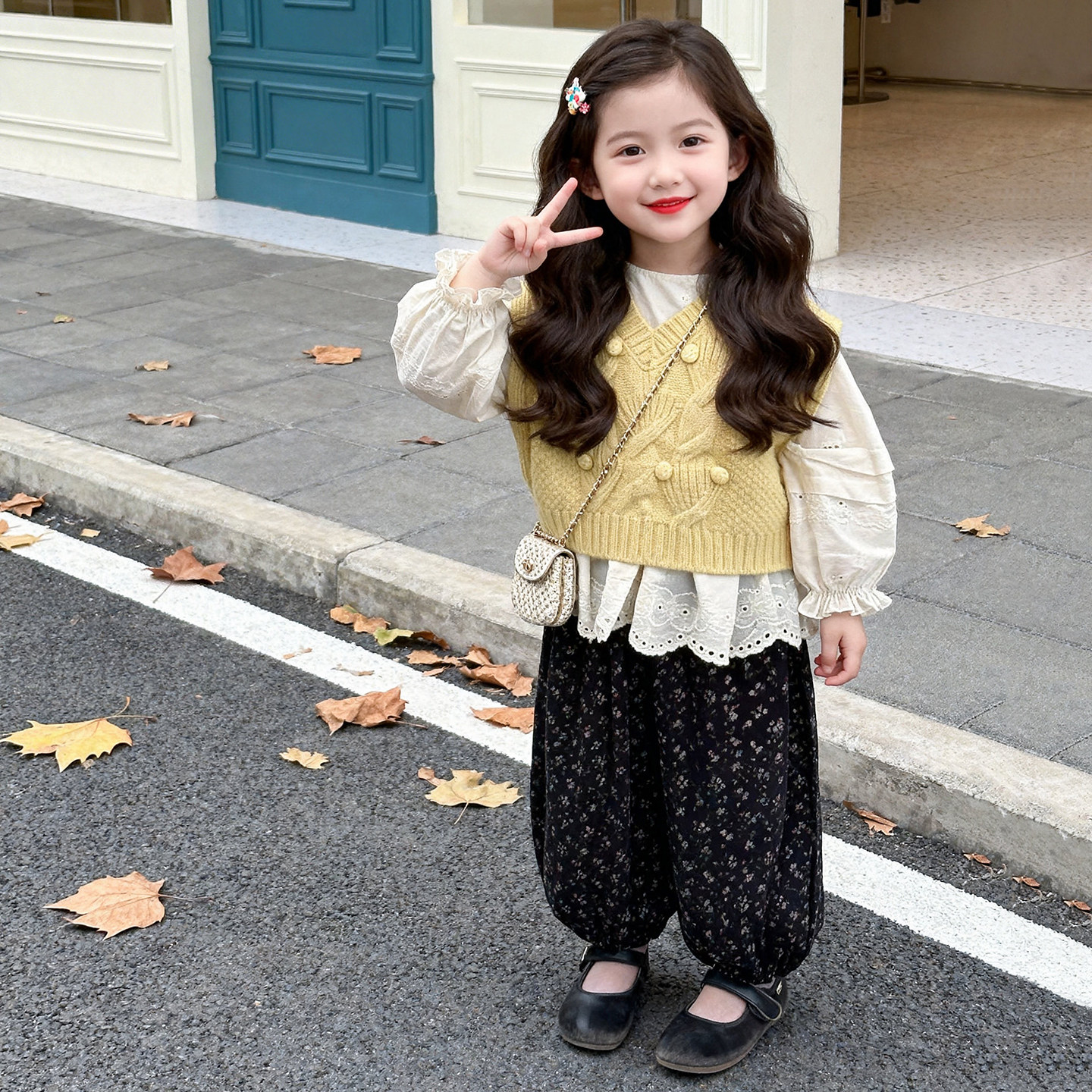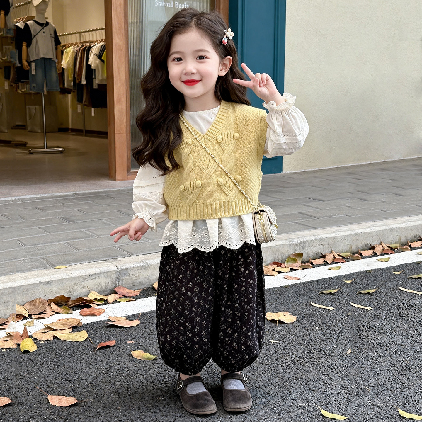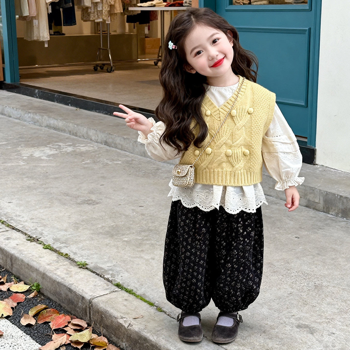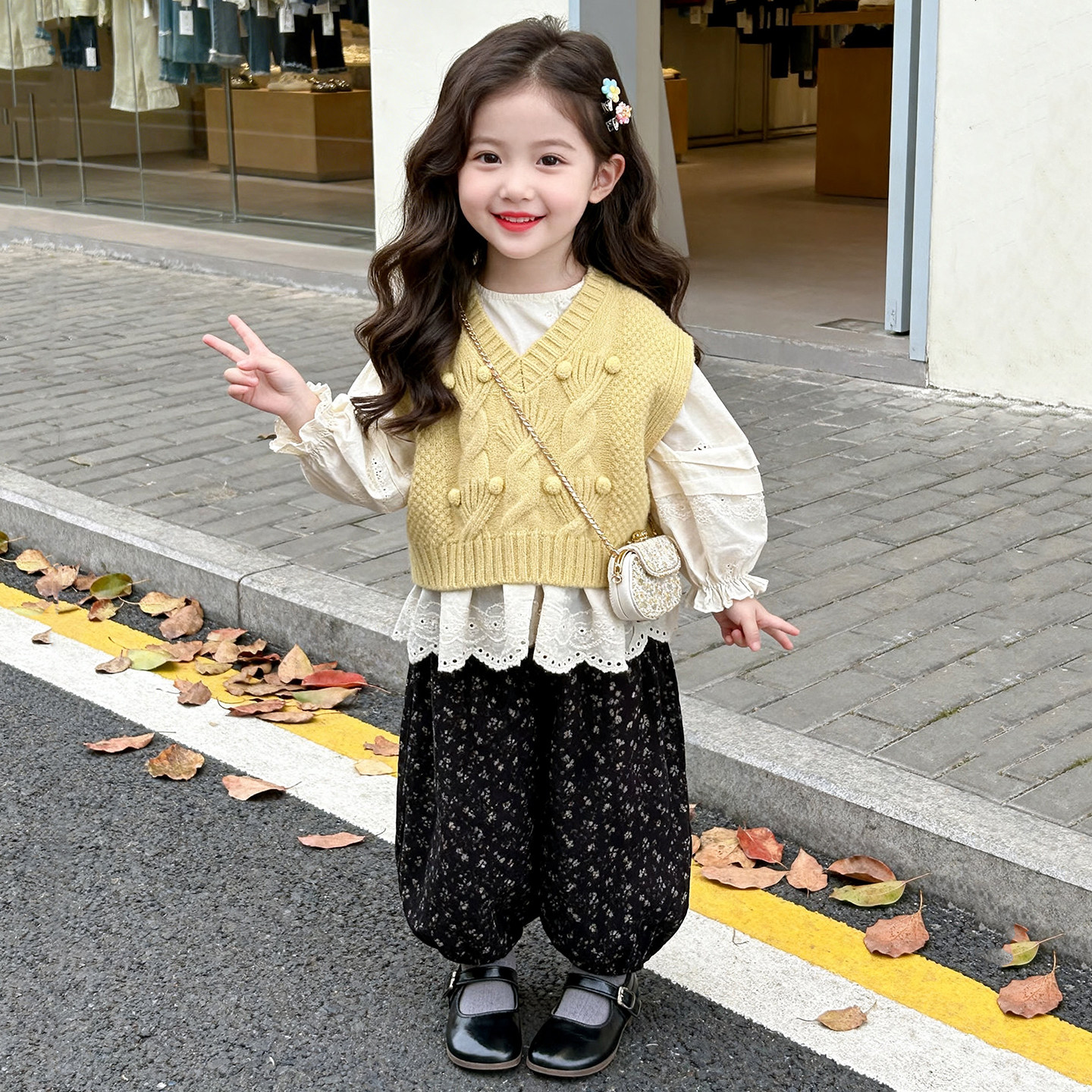 女童毛衣马甲套装春季2026新款洋气儿童娃娃衫春装碎花裤子三件套