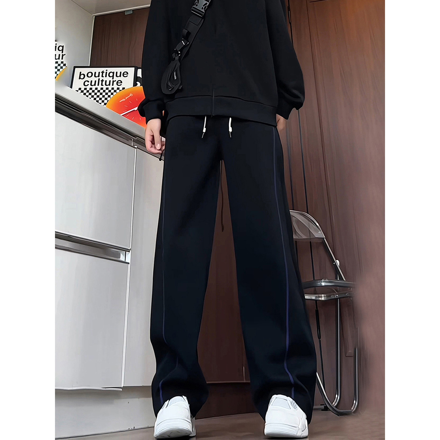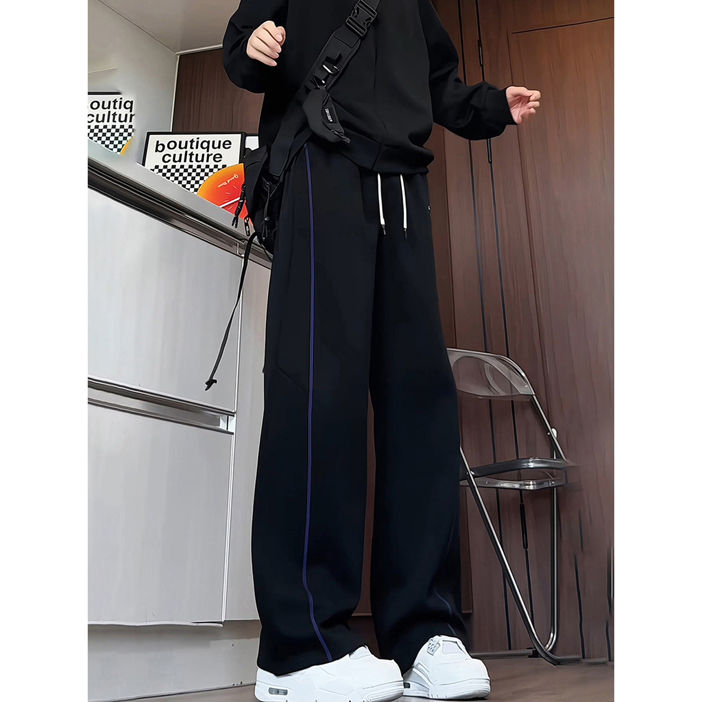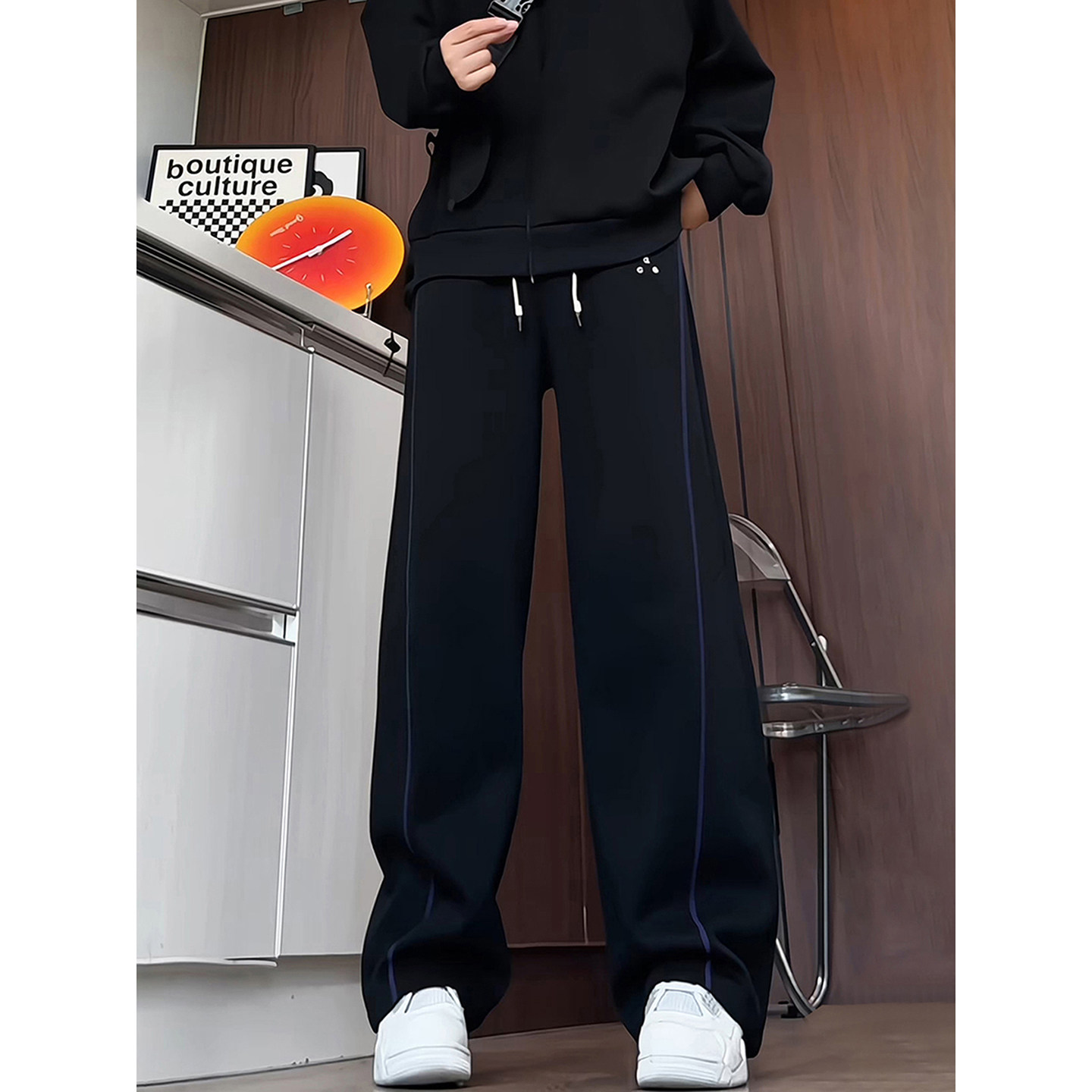 黑色美式条纹运动卫裤男款春季青少年酷帅裤子加长宽松直筒休闲裤
