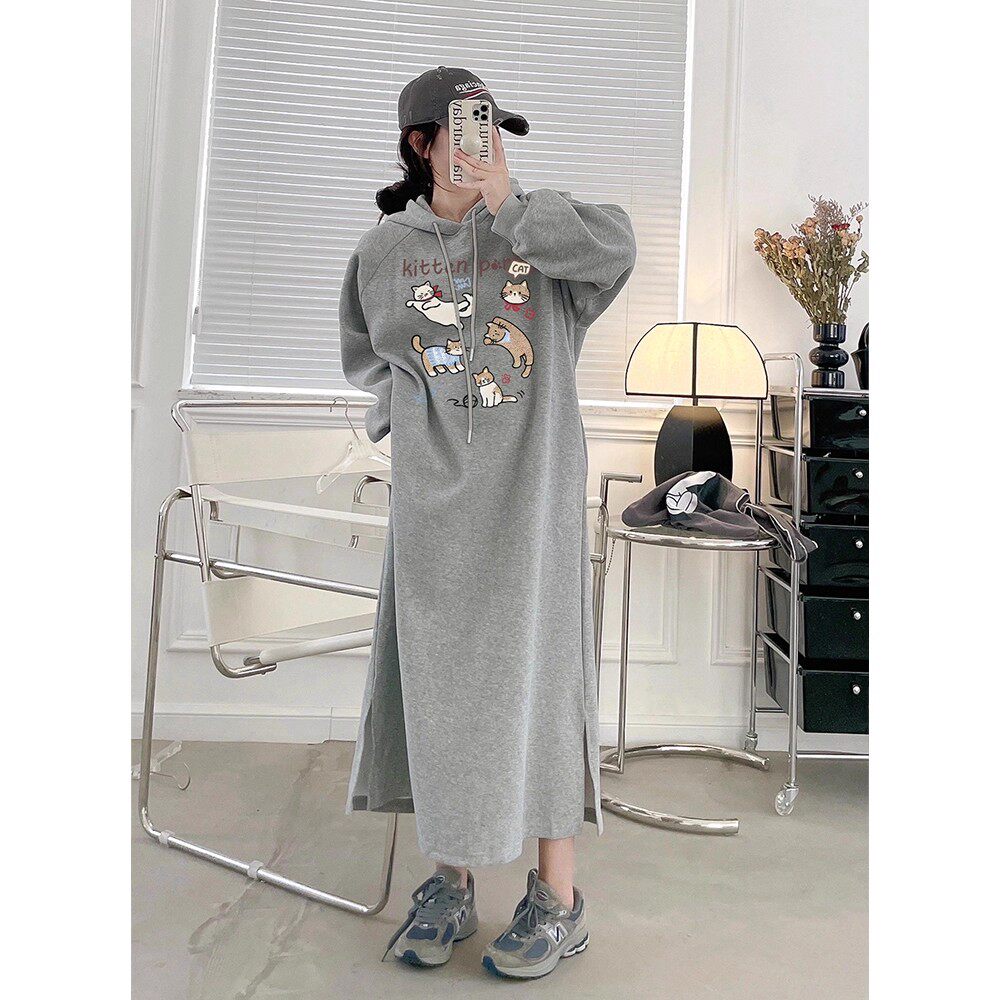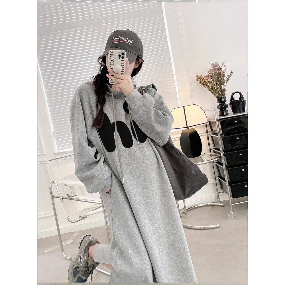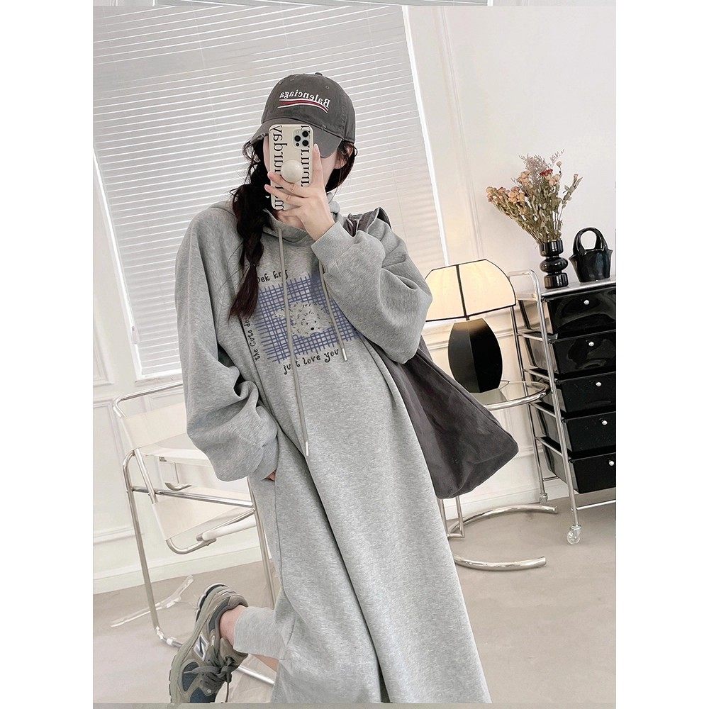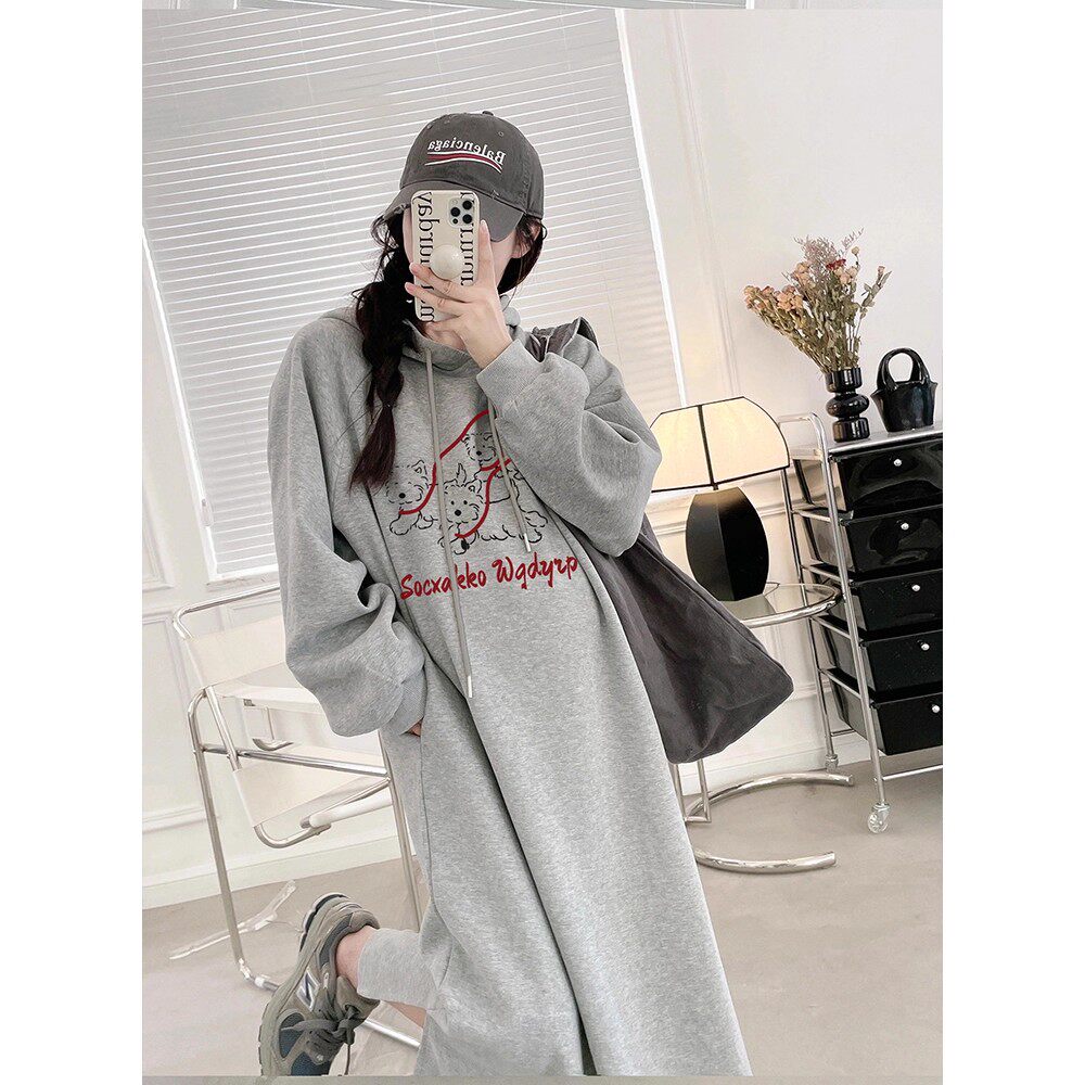 敏潮格伦慵懒风长袖连衣裙女装秋冬新款宽松休闲连帽卫衣裙长款