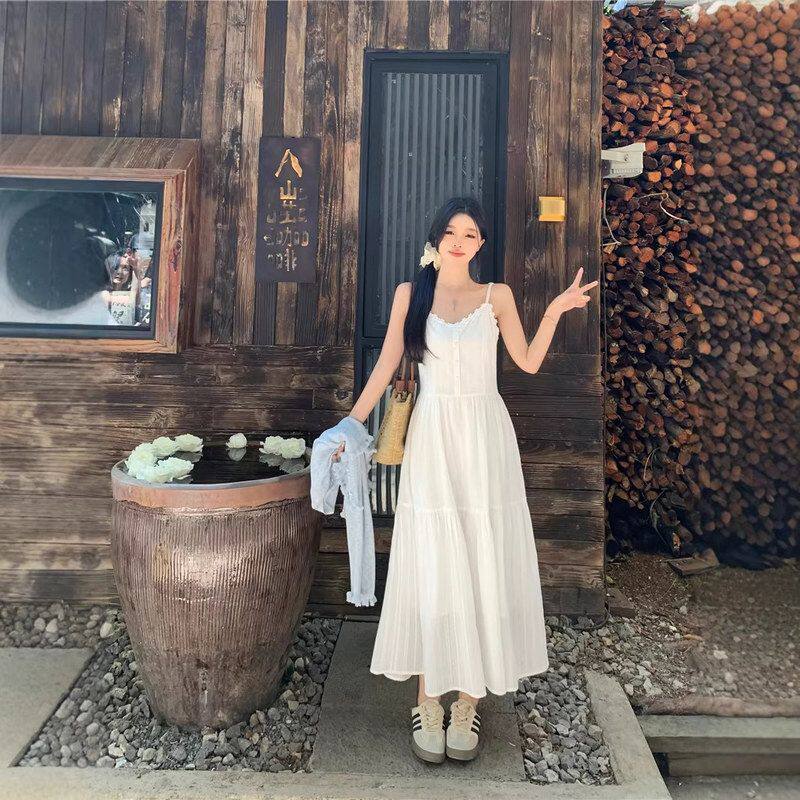 大码温柔初恋感白色吊带连衣裙胖MM春夏季气质海边渡假显瘦长裙子
